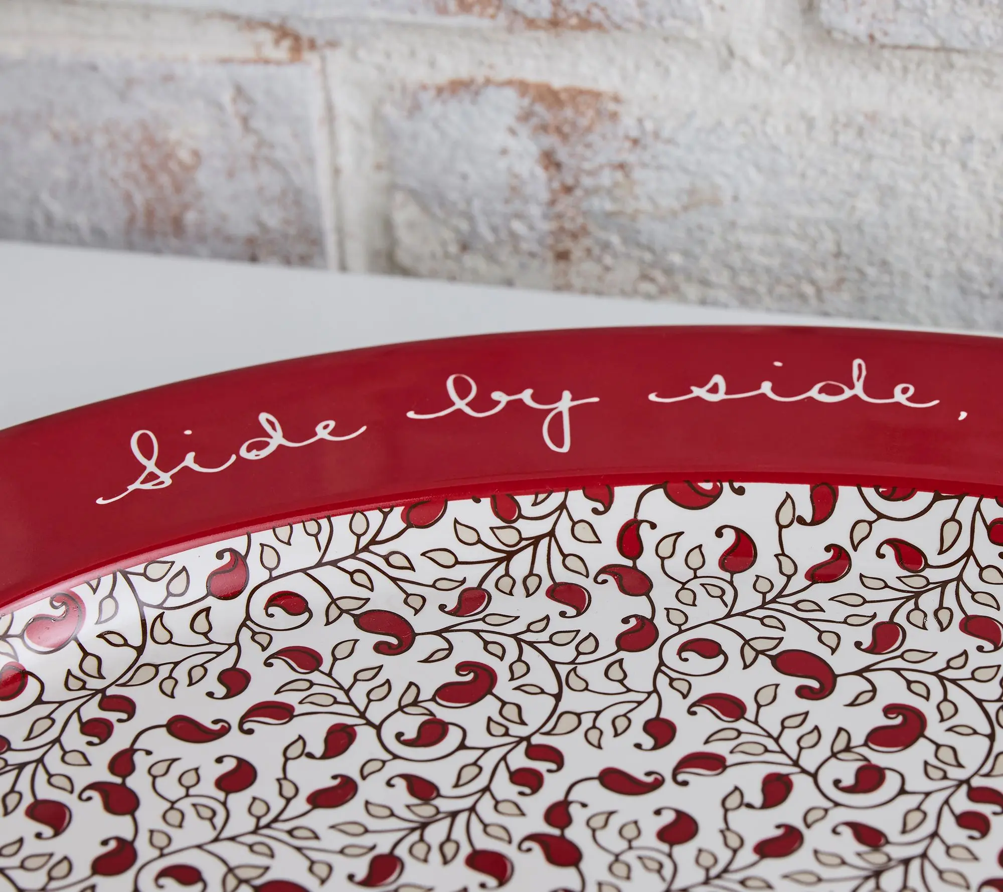 This Aarti Sequeira Side By Side, or Miles Apart Serving Platter is exactly what you need to add to your kitchen. The Oval platter is perfect for entertaining! Measures approx.: 18-1/4"L x 12-1/4"W x 1-1/4"H. Dishwasher Safe, Microwave Safe, Oven Safe to 350 F and Freezer Safe. Made of stoneware. Choice of: Saffron. Imported.