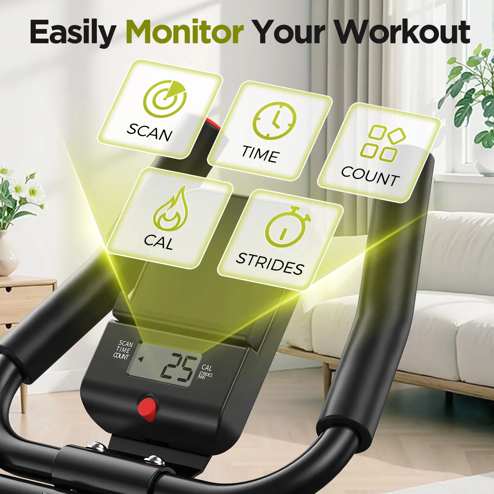 The larger LCD monitor circularly shows the Repetitions, Workout Time, and Calories Burnt, which allows you to track each workout routine and make your next exercise plan. Order today and get a 1 year cover on the frame, 30 days cover on the parts.