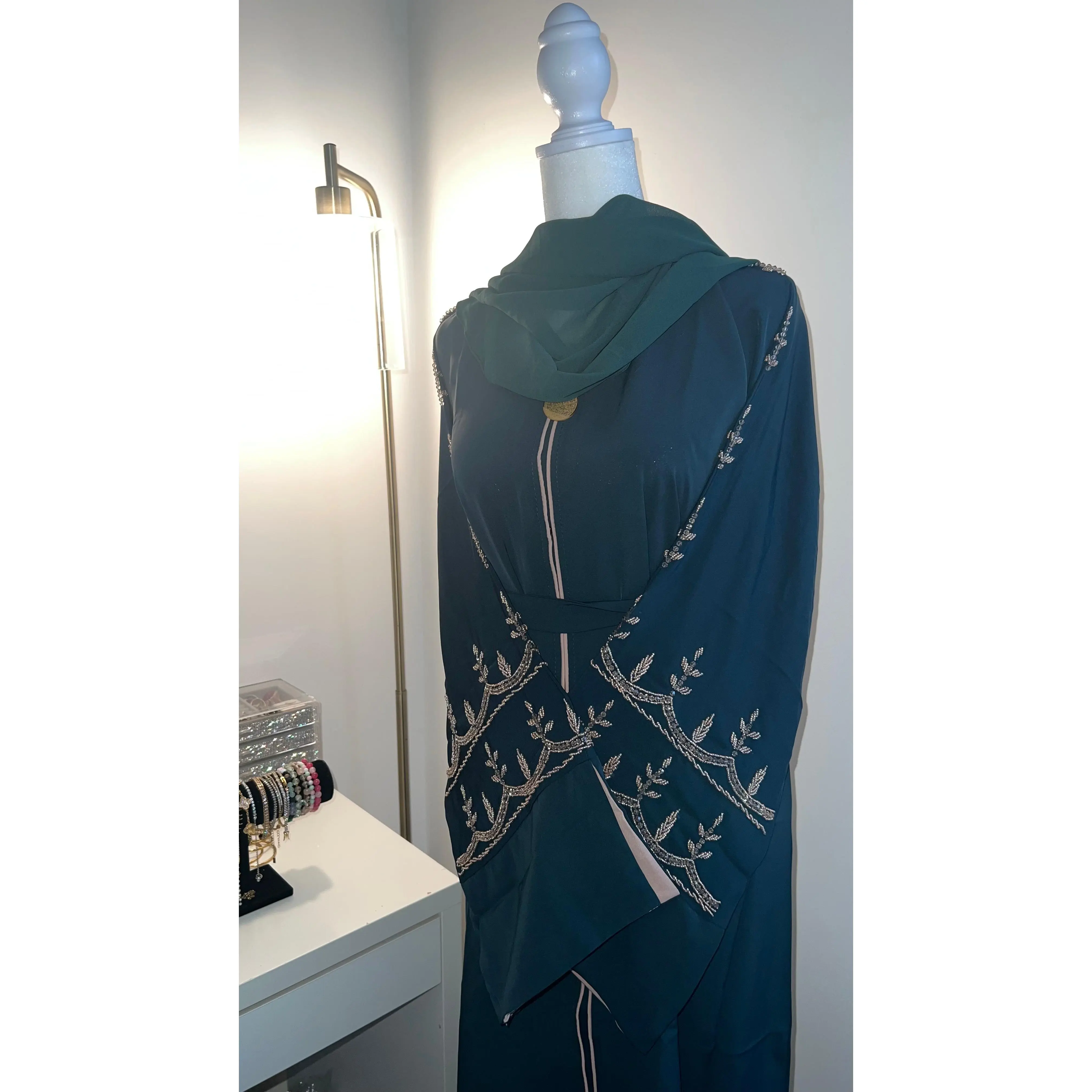 This color is so pretty in person allahumma barek , it’s in between an emerald and sea green and the gold embroidery really pops out. I bought 3 different colors of this abaya and the green is my favorite.