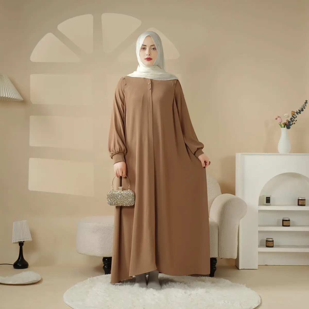 Full-length, single-piece abaya with a round neckline.