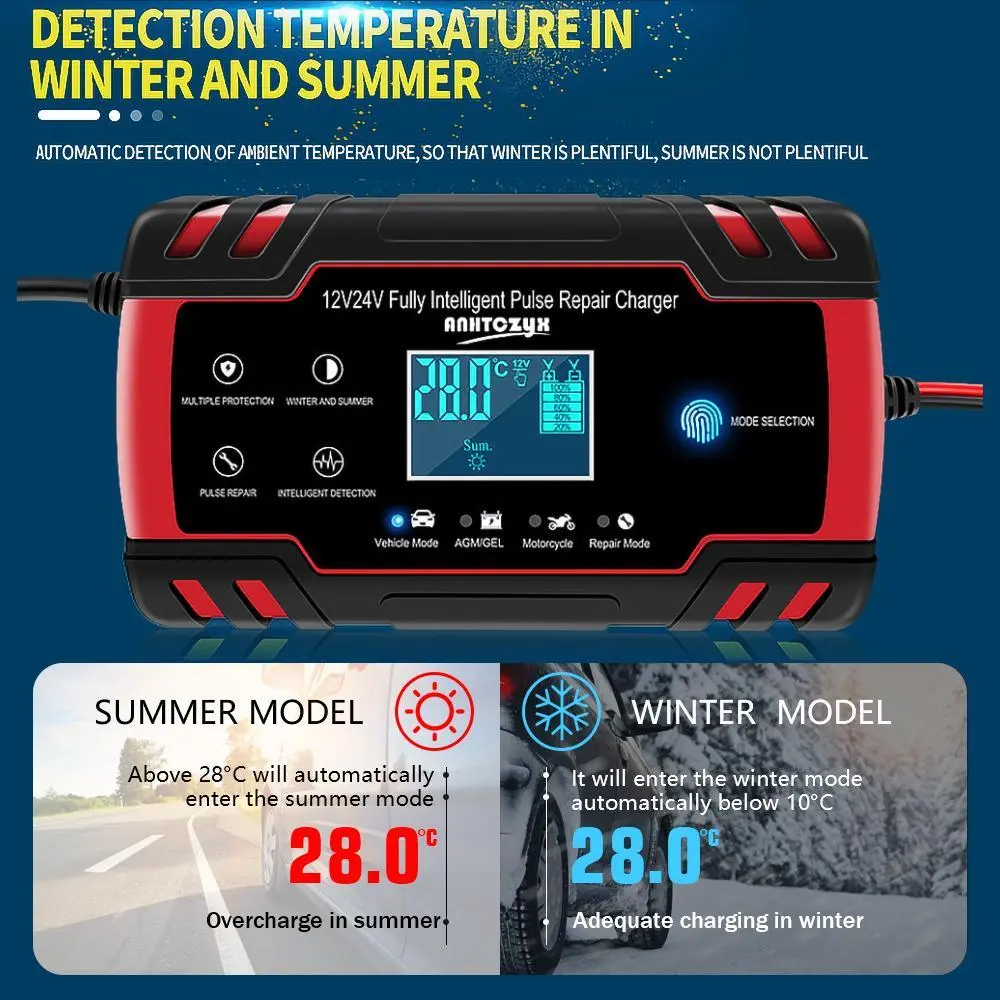 ·[Intelligent LCD Touch Digital Display] Portable trickle charger for car battery with LCD screen displays battery status, charge voltage, charge current, inside temperature, summer mode, winter mode, etc., simple operation and an easy-to-read display—automatic charging and maintenance of your batteries for a long time when plugged in.