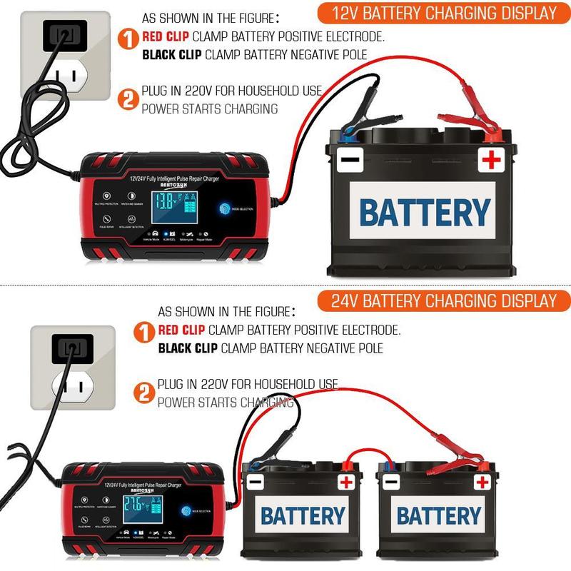 ·[Multiple Safety Protection, No Worries!] Adopt ABS flame-retardant shell, fireproof, electric shock, corrosion resistant, solid and durable, Built circuit protection guards against reverse polarity, sparks, overcharging, over-current, open-circuits, short-circuits and overheating, stable performance for longer life. This 12V 24V car battery charger ensures the adaptive charging process with maximum safety and automatically stops when fully charged.