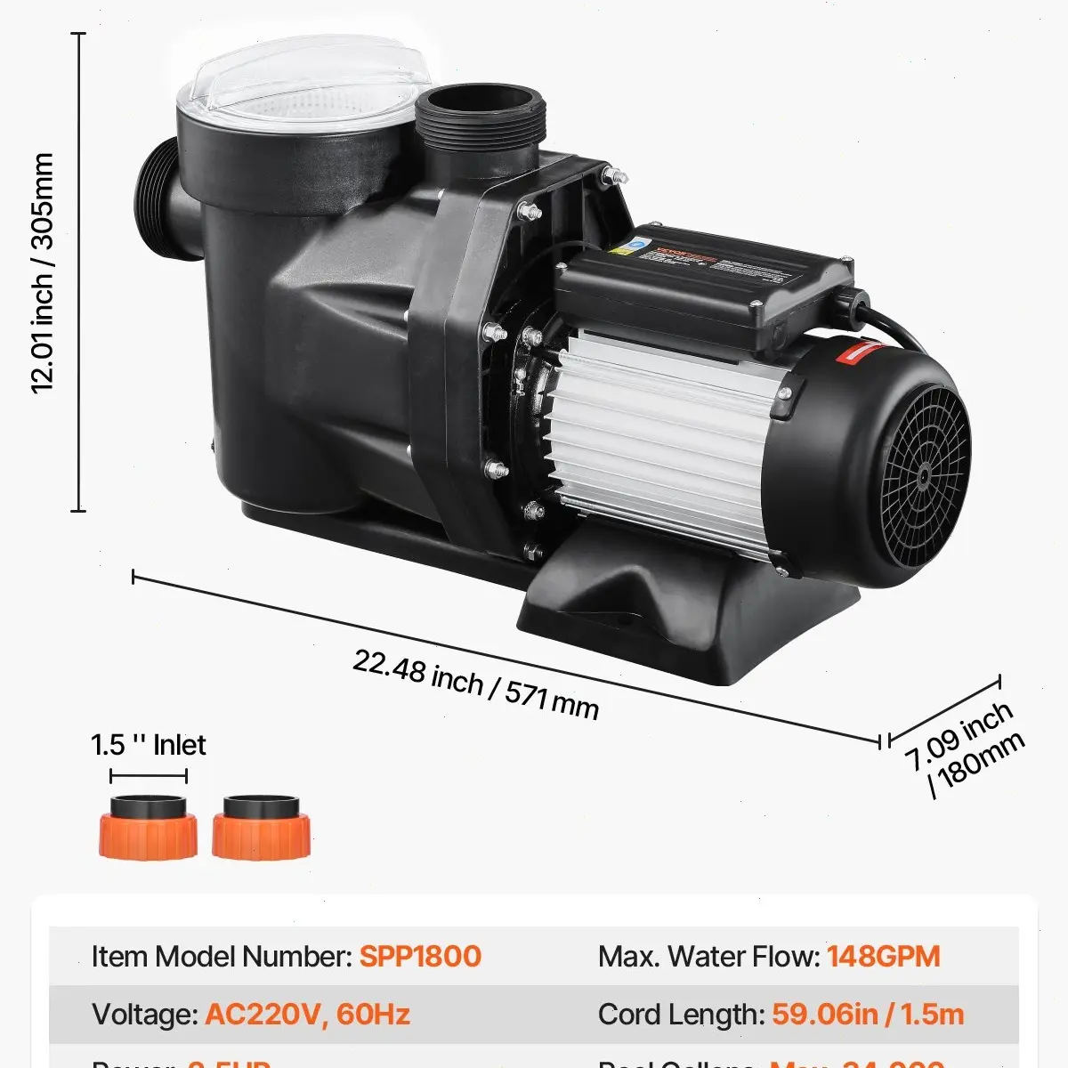 ·1.5 HP Premium Copper Motor: Voltage: 220V / 60 Hz. Powered by a pure copper motor, this above ground pool pump ensures efficient and stable operation with built-in thermal protection. It's ideal for continuous water filtration, keeping your pool clean and clear. Note: Power cord not included