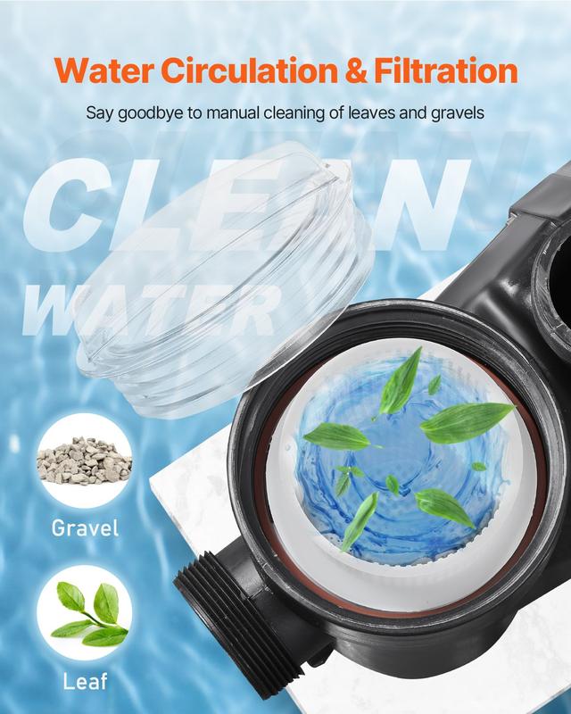 ·Efficient Water Circulation System: With a continuous flow rate of 122 GPM and a maximum lift of 55 ft, this pool pump provides fast and efficient water circulation. The detachable filter basket can be paired with a sand filter (sold separately) for enhanced physical purification. The PVC lid lets you easily check when the basket needs cleaning. No more dirty pool water, always ready to enjoy a spotless pool