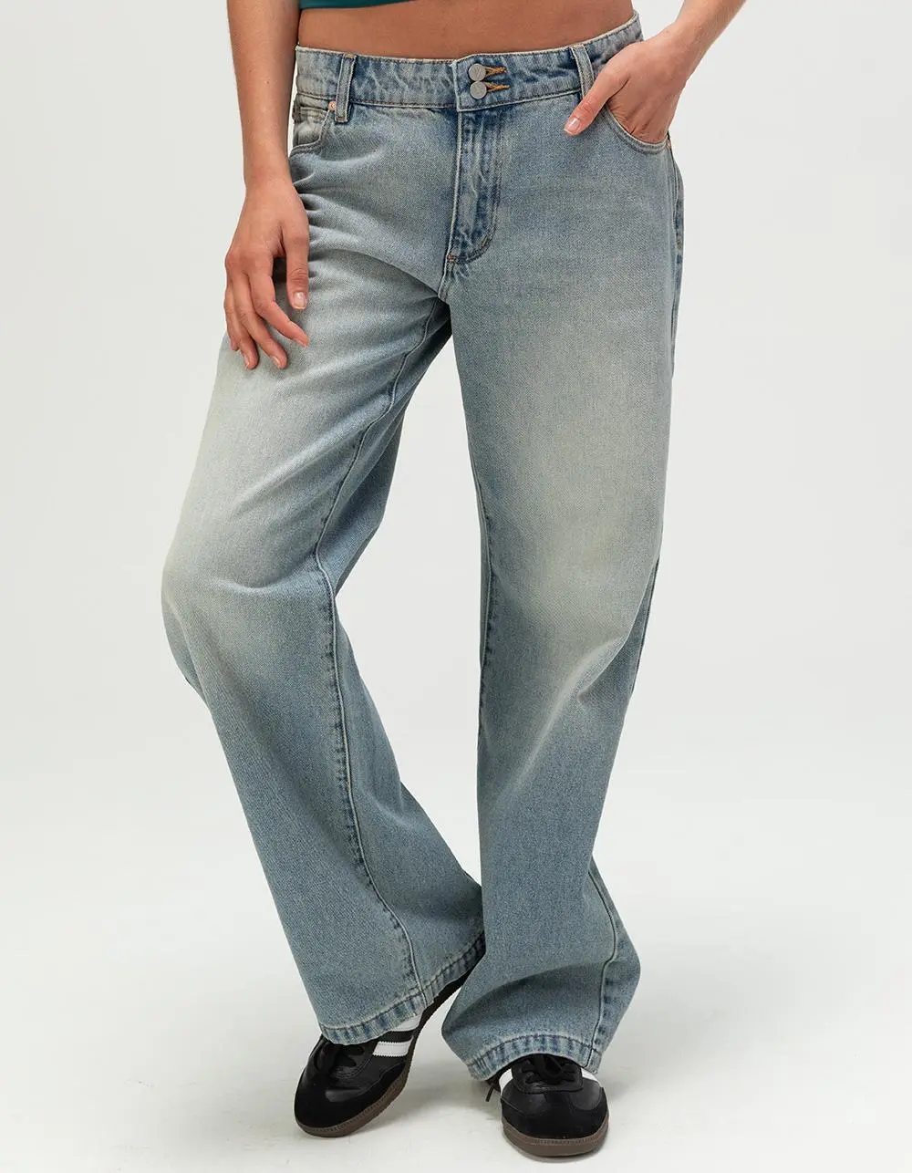 Abrand Caitlin 99 Low Baggy Jeans. Designed with a low-rise waist that sits on the hips and a baggy fit around the butt and thighs, these jeans bring '90s-inspired style to any outfit. Featuring a long, straight leg that elongates your silhouette, these jeans can take you from day to night without a worry. 5-pocket denim styling. Double button closure with zip fly. Slight fraying. Baggy fit. Approximate leg opening: 18". 91% Cotton 5% Viscose 4% Polyester. Machine wash. Imported. | ABRAND Caitlin 99 Low Womens Baggy Jeans