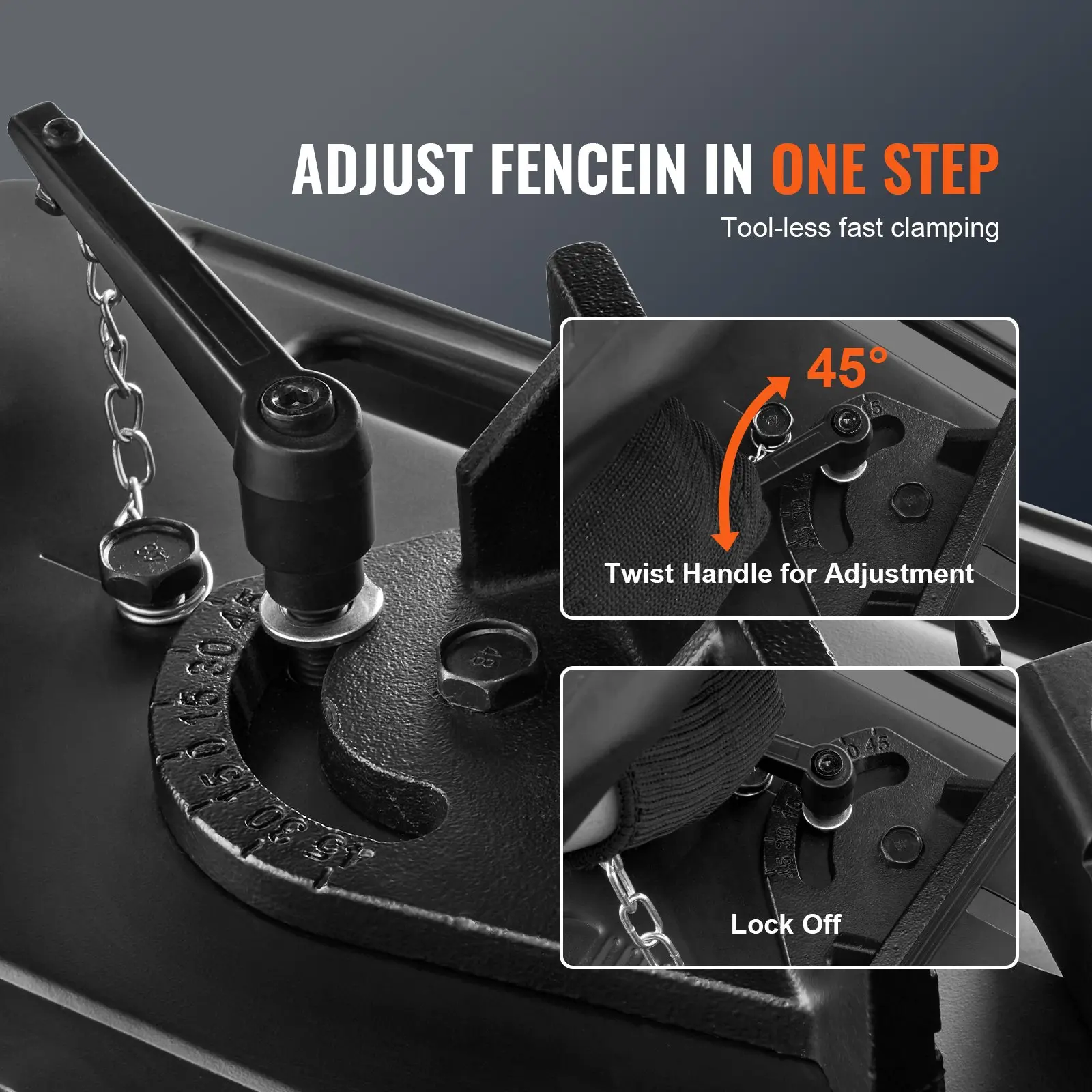 ·0-45° for Angled Cuts: Make angle cuts effortlessly. 45-degree adjustable fence helps you adjust the angle of materials at any time according to your cutting needs. Compared with traditional devices, our Tool-less Cut-Off Saw does not need a wrench to adjust. Instead, gently turn the adjustment device to change the angle easily.