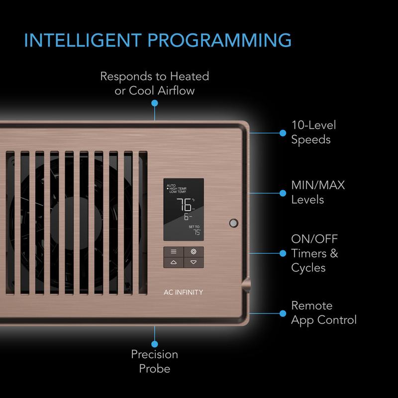 A quiet register fan system designed to improve airflow coming from your central AC or heating system. With this fan, you can boost the amount of cool or warm air exhausted from registers where airflow is traditionally weak. This will improve your rooms' comfort level while reducing energy costs. It features an onboard smart controller programmed with cooling and heating triggers, timer and cycle programming, and 10-level speeds. You can access these controls and more remotely by connecting to the AC Infinity app using Bluetooth. The register booster fan is finished with a premium aluminum front plate with CNC-machined detailing that gives a clean aesthetic to your register.