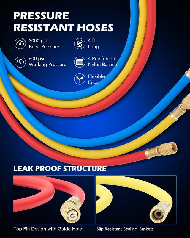 The AC manifold gauge provides precise real-time monitoring of your coolant's condition; the color-coded charging hoses are constructed with four layers to withstand pressures up to 600 psi (with a burst pressure of 3000 psi).