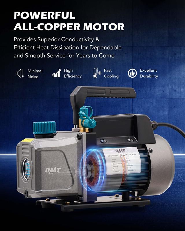 Featuring an all-copper motor, this vacuum pump ensures efficient evacuation at a 3.5 cfm flow rate. Its aluminum alloy casing effectively dissipates heat, resists corrosion, while brass-fitted tethered safety caps prevent oil leaks.