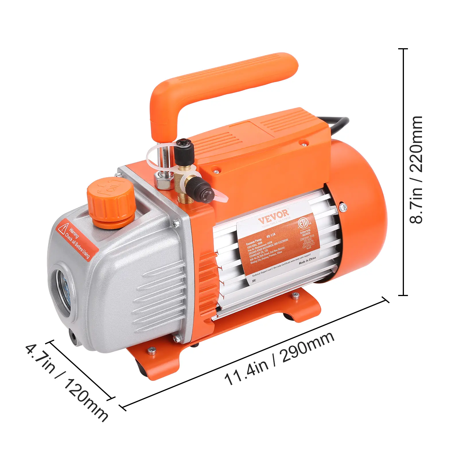 • Heavy Duty Vacuum Pump: Single-stage pump is designed for higher and more stable ultimate vacuum. It maintains the air conditioning system by effectively moving moisture before refilling it with refrigerant. Free Air Displacement: 4 CFM, Ultimate Vacuum: 40 microns, Intake Fitting: 1/4"SAE male and 1/2"ACME male, Speed: 1720PRM, Voltage/Frequency: 120V/60 Hz, Power: 180W, Oil Capacity: 200 ml.