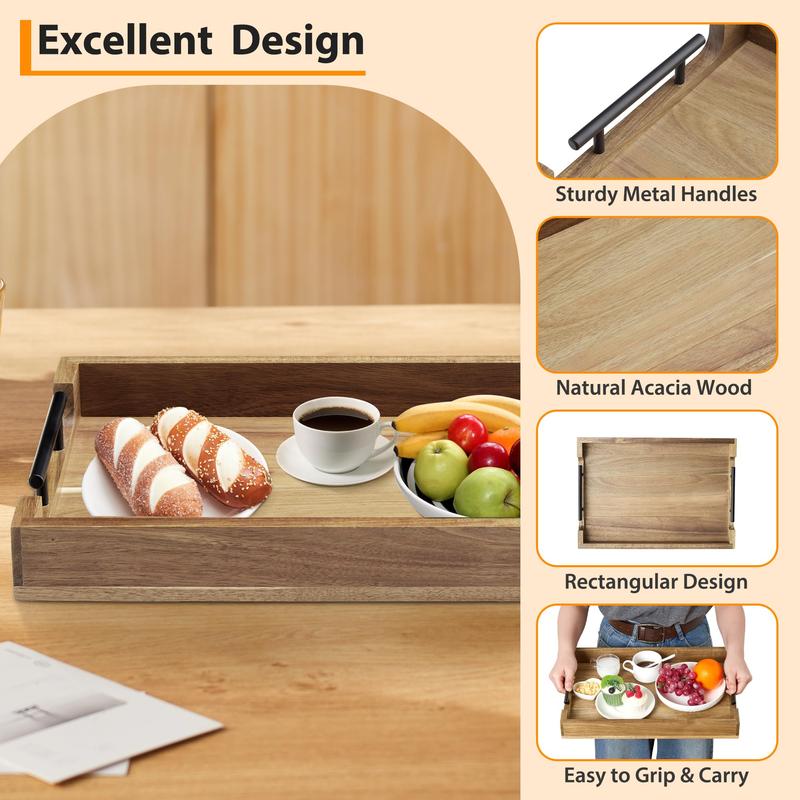 · ✅ Premium Acacia Wood Tray with Sturdy Metal Handles: 17"x12" rectangular tray crafted from durable acacia wood, paired with solid metal handles for easy carrying. Combines rustic charm with daily practicality, perfect as decorative coffee table tray or ottoman tray.