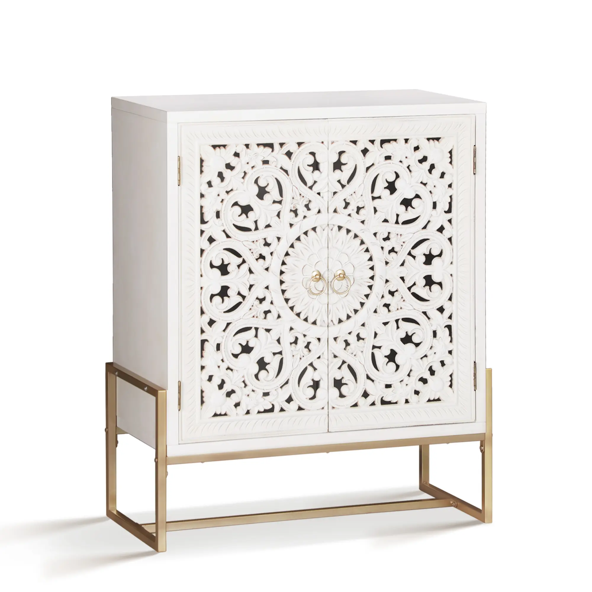 With its beautiful engraved design on the doors, this cabinet is sure to be a decorative and functional piece that you will love for years to come.