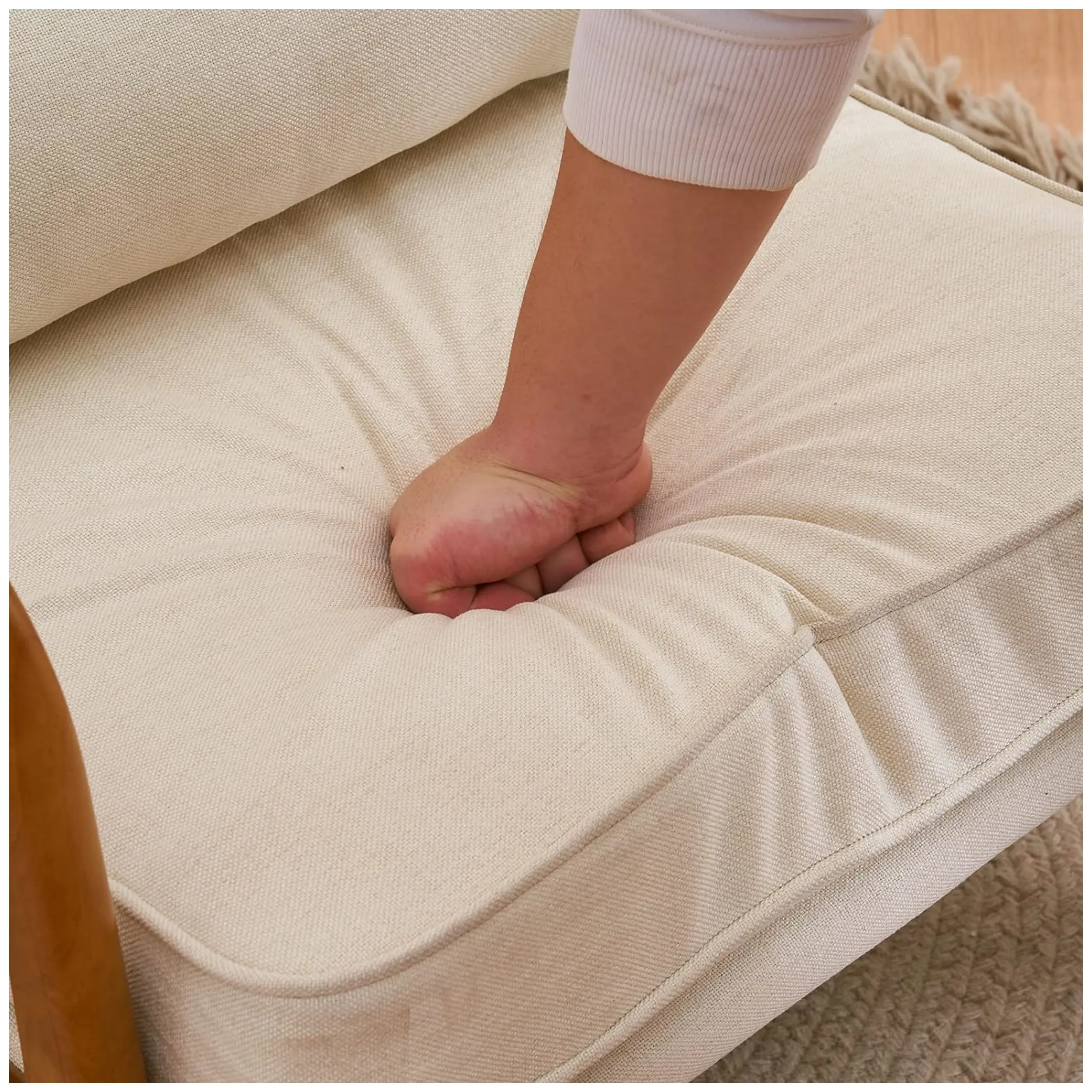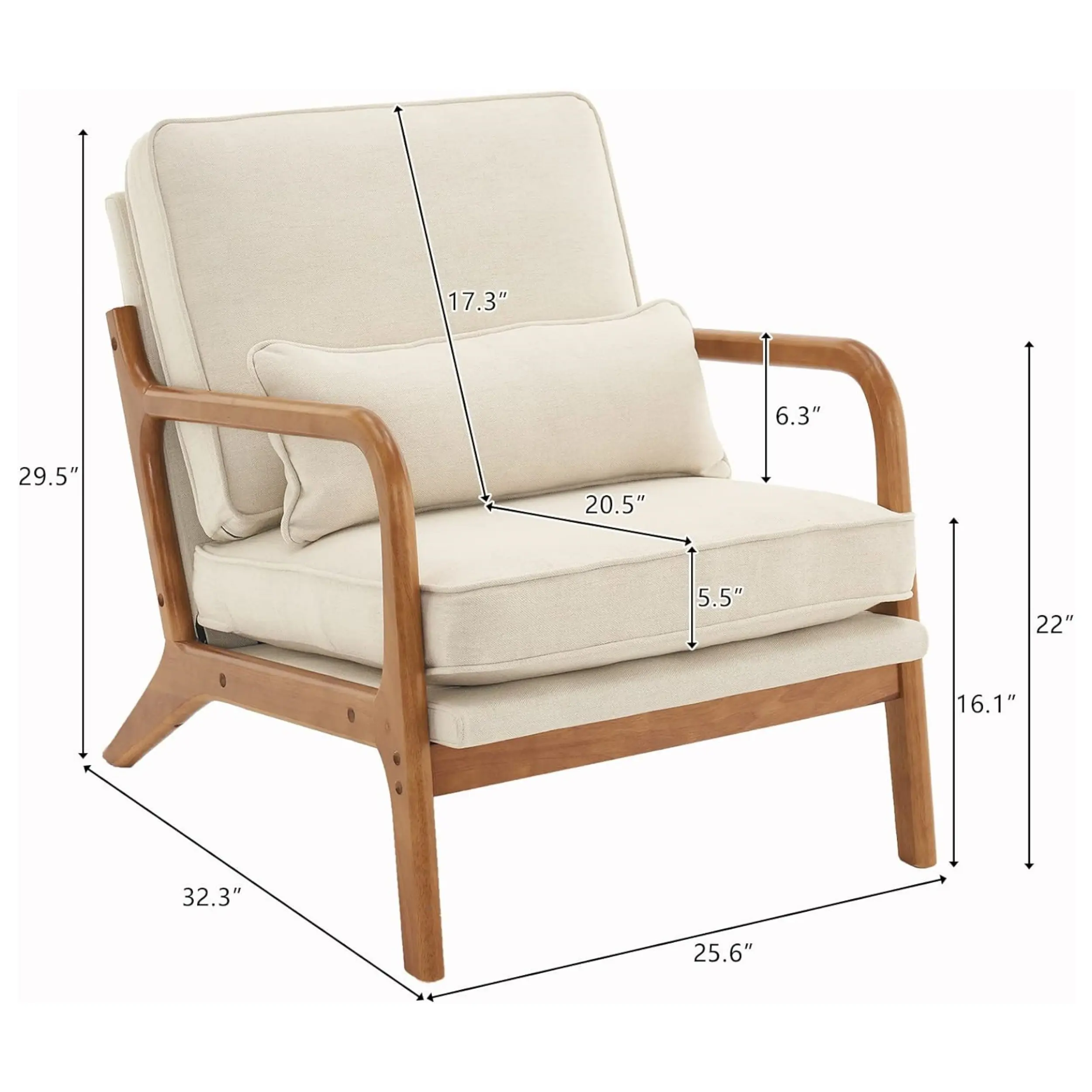 Specifications: 1. Material: Solid Wood Armrest Linen 2. Color: Off-White 3. Dimensions: (25.59 x 29.53 x 31.89)" / (65 x 75 x 81)cm(L x W x H) 4. Weaght: 30.86lbs / 14kg