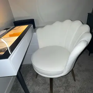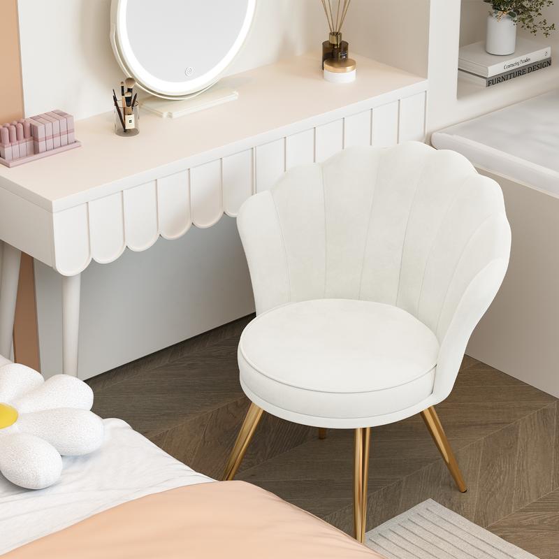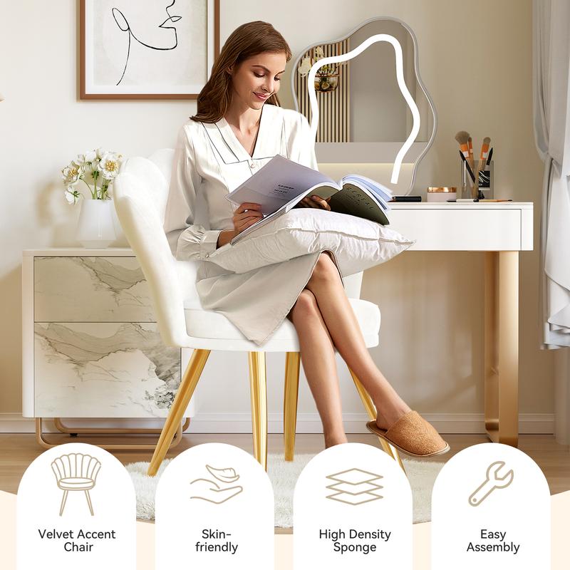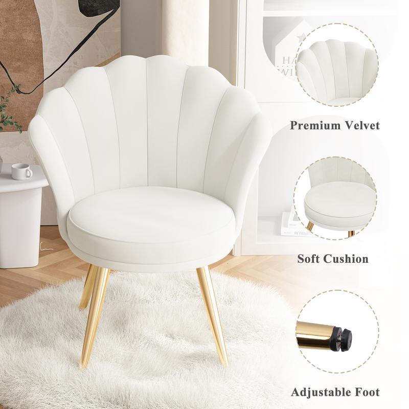 ·【Elegant Velvet Chair】Featuring a shell-shaped design, graceful curves, and soft velvet upholstery with golden legs, this vanity chair exudes style and classic elegance. Ideal as a guest chair, vanity chair, or side chair, it brings cloud-like softness and a luxurious touch to any room.