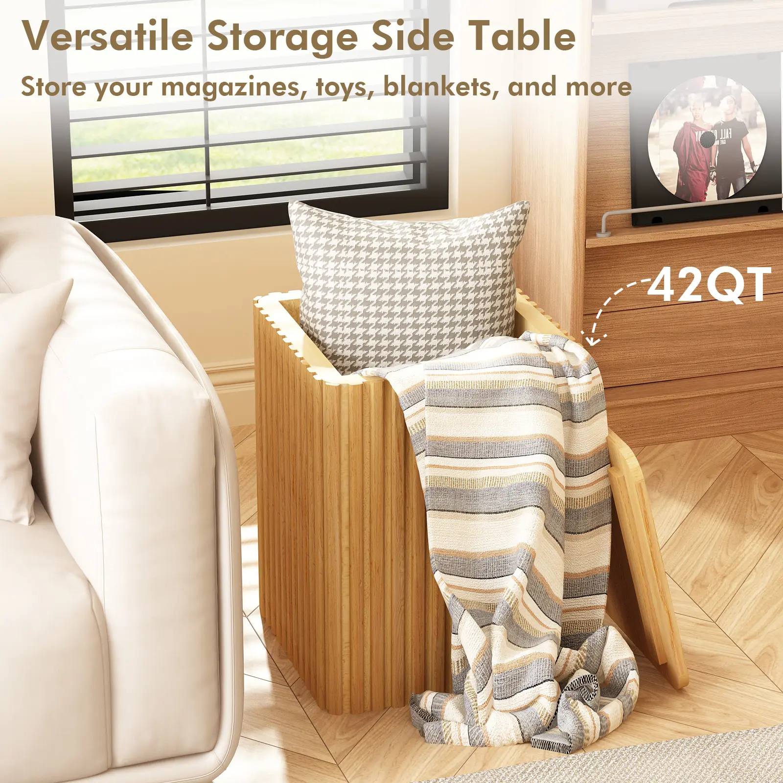 Concealed Storage Solution:Boasting a capacious hidden compartment, this compact end table provides an abundance of room to tuck away cushions, throws, TV remotes, and miscellaneous items. It’s your secret weapon for keeping the living space neat and clutter-free.