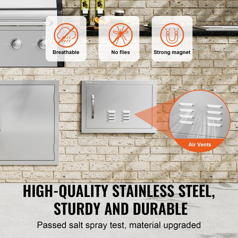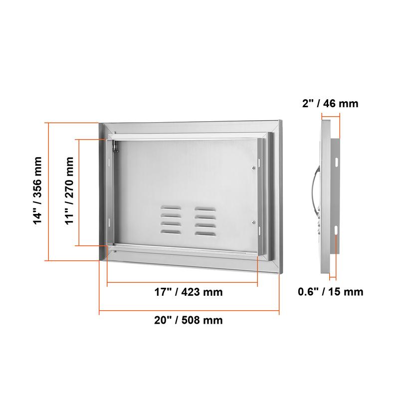 • Precision Opening: Overall dimensions: 508x356x46 mm / 20x14x2 inches, installation size: 17x11inch/423x270mm, it is recommended to reserve an additional 0.08inch/2mm on this basis for better operation. The door is designed specifically for outdoor kitchens and barbecue islands, adding an elegant touch to your cooking area. With precise dimensions, it is easy to process, install, or dismantle. Available in various sizes and styles, it is perfect for indoor/outdoor kitchens and all other outdoor weather conditions.