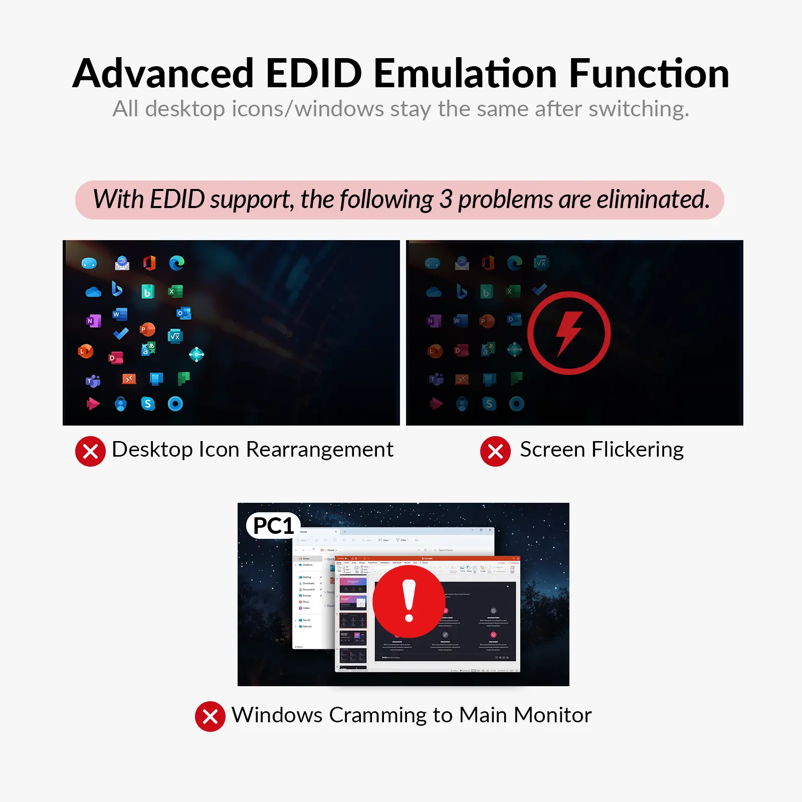 Maintains consistent monitor connections with your PC. No more desktop reshuffling after switching.