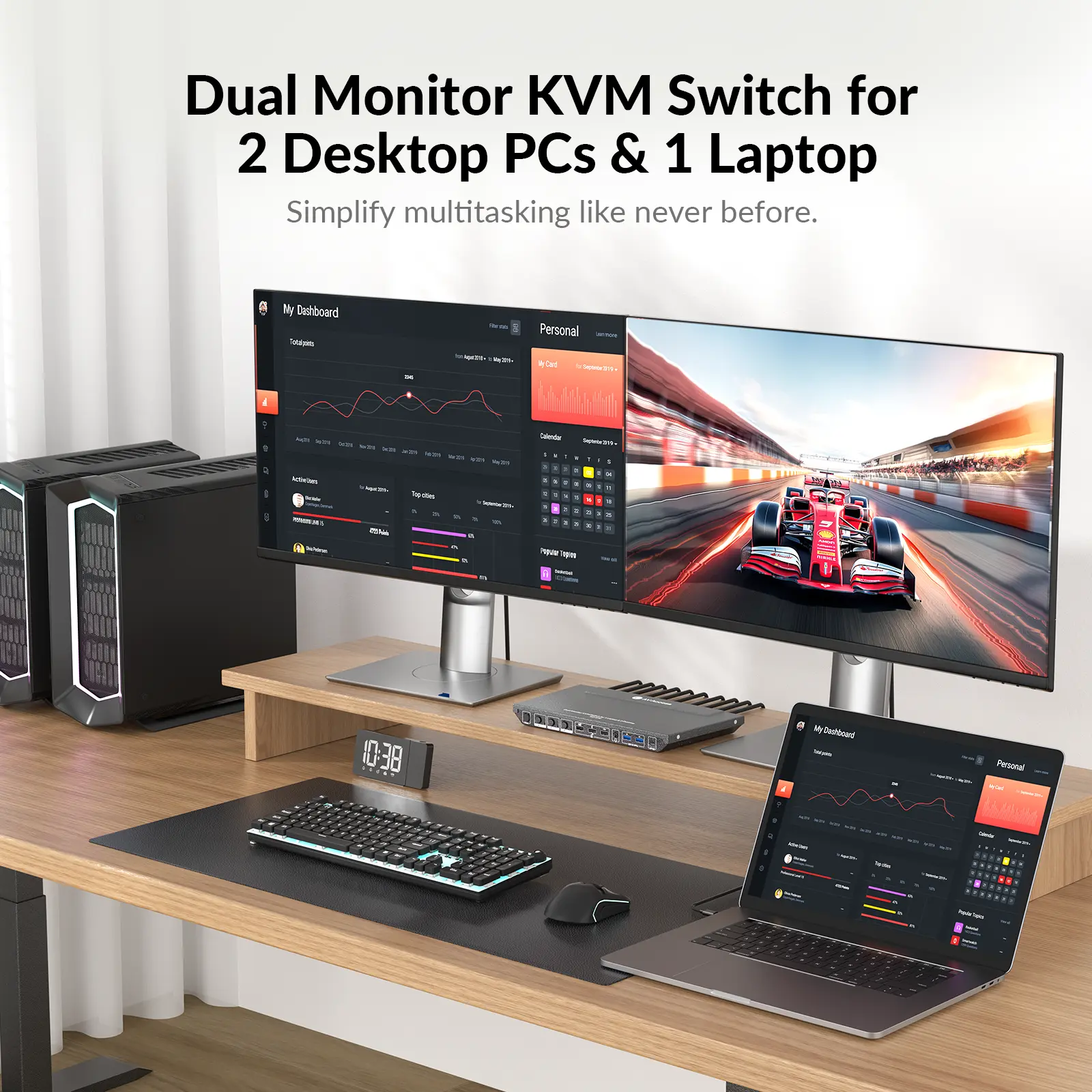 Connect 1 laptop and 2 desktops and switch fast on dual screens.