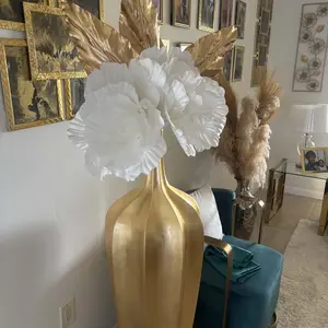 Accolade Vase to make a striking impression in a room. The simple lines of a classic fluted vase are accentuated by the substantial scale, measuring 16.25 inches diameter by 48.75 inches tall, while the fluted surface makes the most of a rich, lustrous gold foil finish. The vase is molded from lightweight materials to make it practical and portable, and creates an exceptional focal point when placed either on the floor or on a large table or shelf.