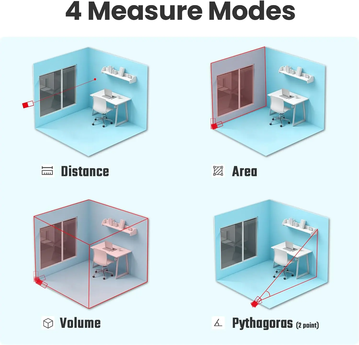 ·4 Multiple Measurement Modes: ACEGMET laser measure features versatile modes including angle, area, distance, volume, and Pythagorean calculations. Simply point and let it handle the calculations for you.