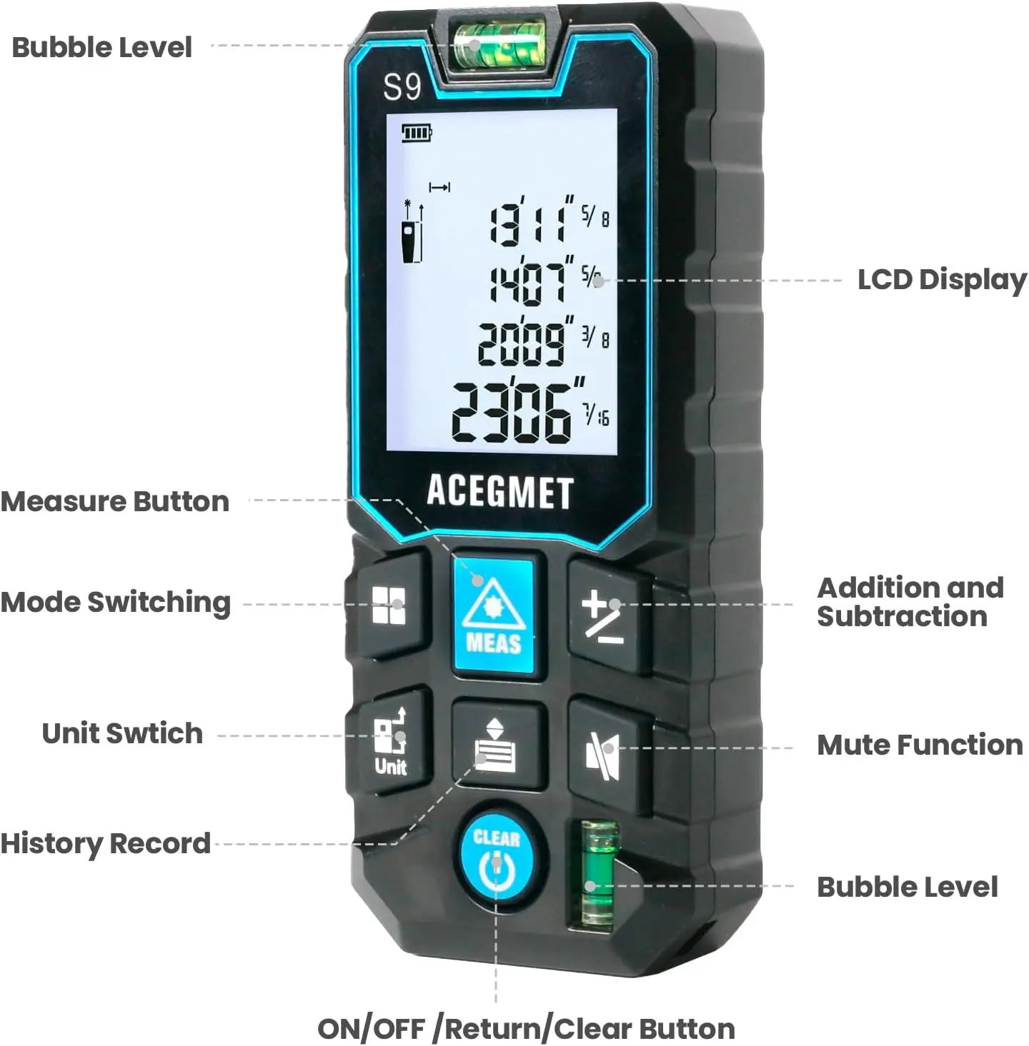 ·Large Backlit LCD Screen: The ACEGMET laser measure features a 2-inch backlit LCD screen for clear visibility in low light. The bright, clear display allows for quick and easy readouts, whether indoors or outdoors, whether reading from the front or the back.