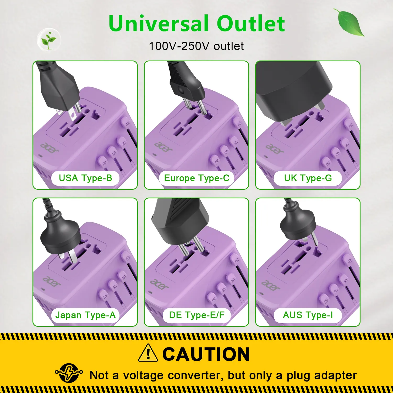 Black, Pink, Blue, and Purple options available. This universal power adapter does not convert voltage. It only changes the plug type. Not suitable for appliances requiring 110V input voltage. 🎨