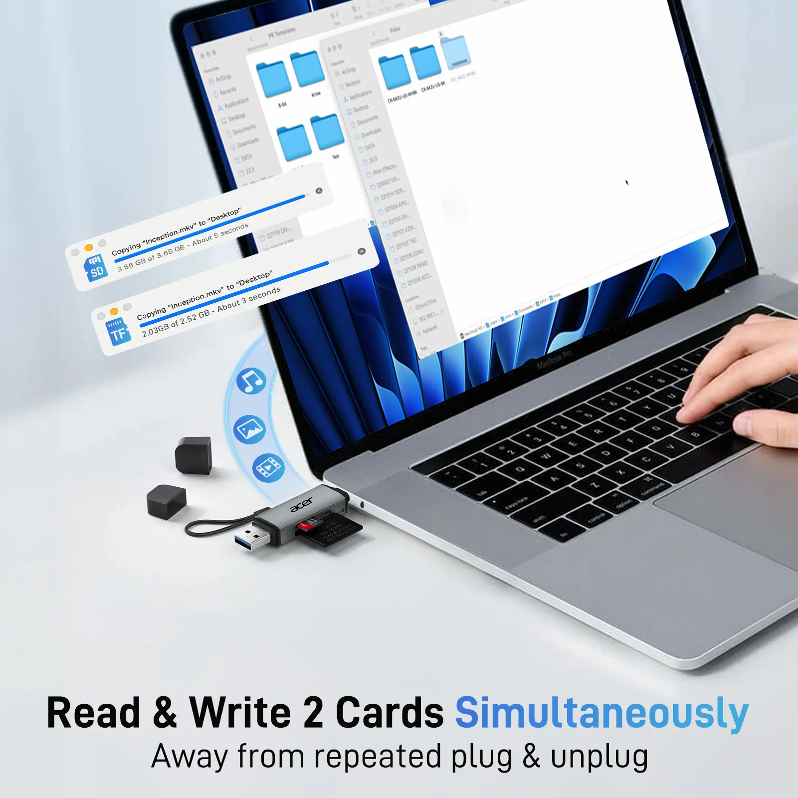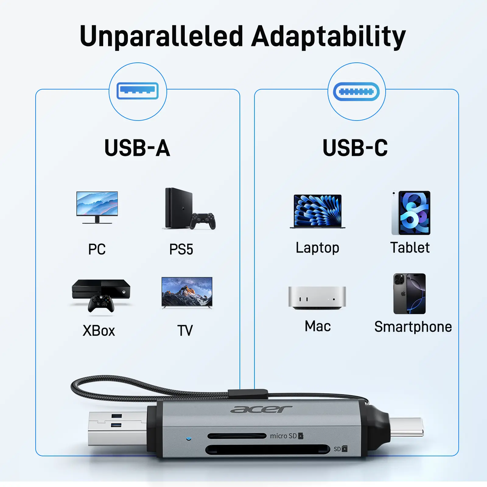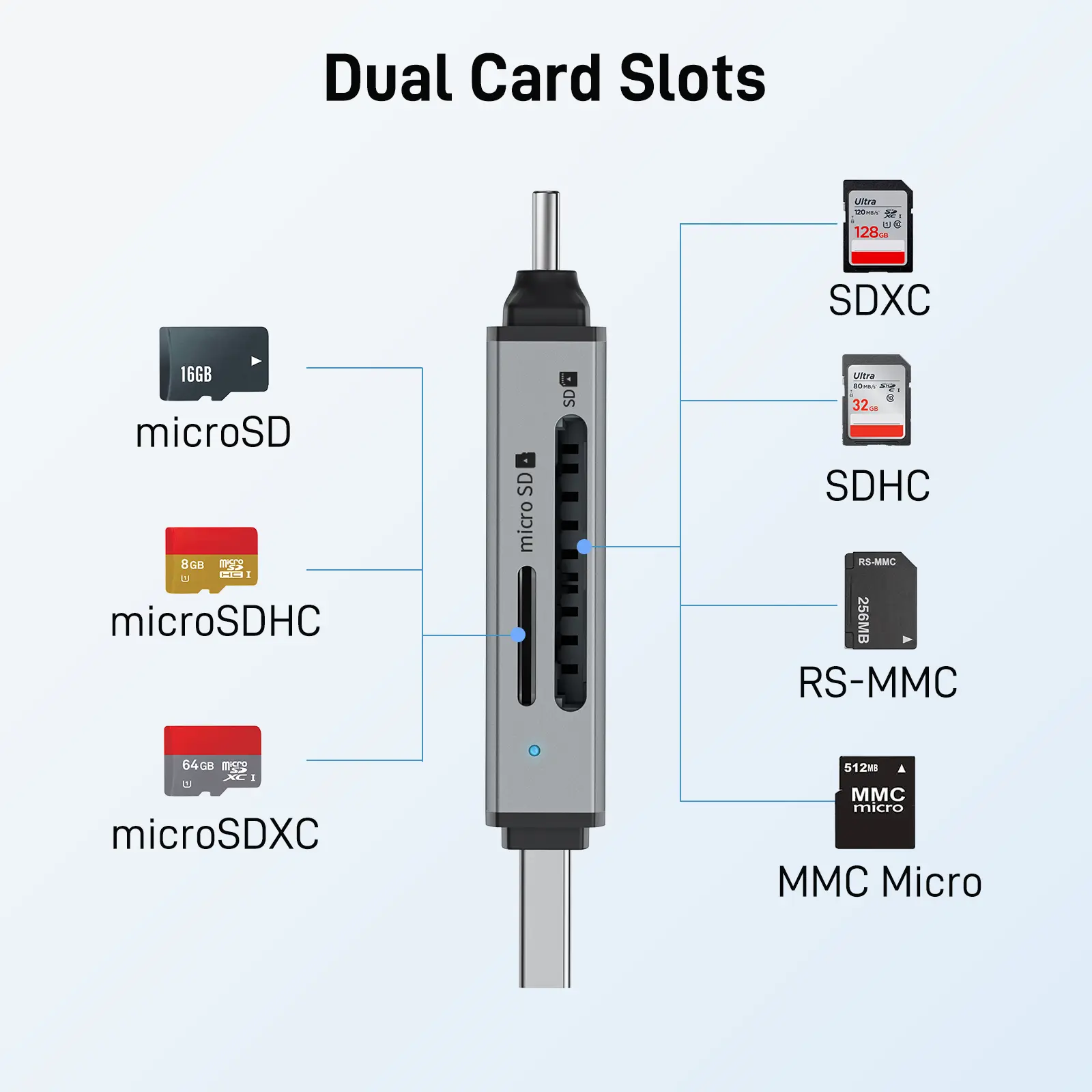 ·【Simultaneous Dual-Card】Save time and boost productivity with dual card slots that allow simultaneous reading and writing on both microSD and SD cards. USB-A and USB-C dual header design makes the micro SD Card Reader perfect for photographers, video editors who need quick and efficient file management(Note:Thick cases may prevent full insertion)