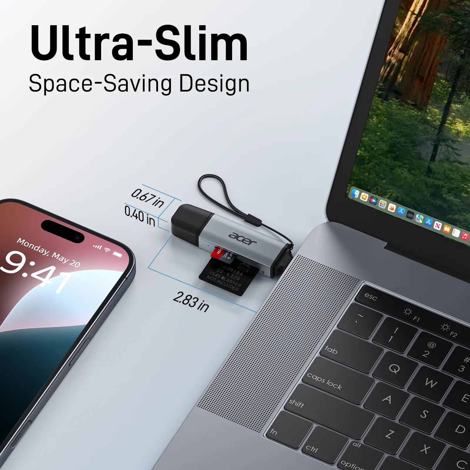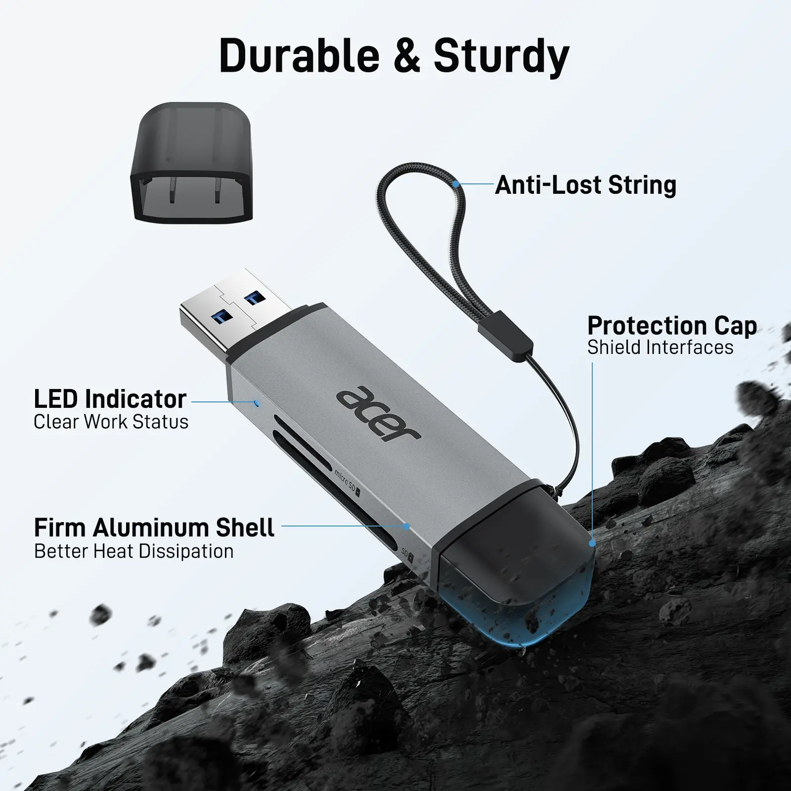·【Compact & Travel-Friendly】Designed for convenience, the slim and lightweight card reader for camera memory card fits perfectly in your camera bag or laptop sleeve. Protective covers at both ends shield the ports from dust and liquid, while the attached cord keeps everything secure and easily accessible. A reliable companion for on-the-go professionals and creatives(Note: "SD"card and "Micro SD" card not included.)