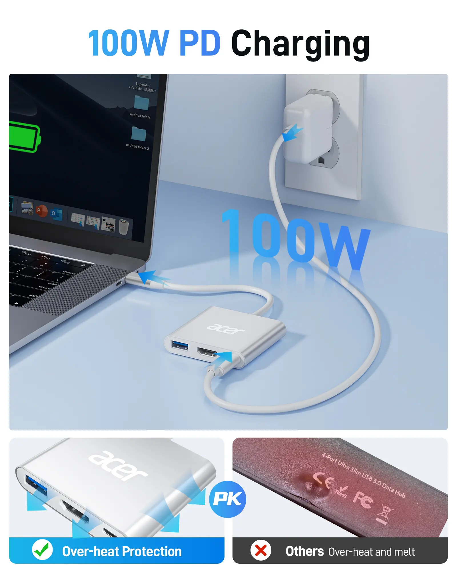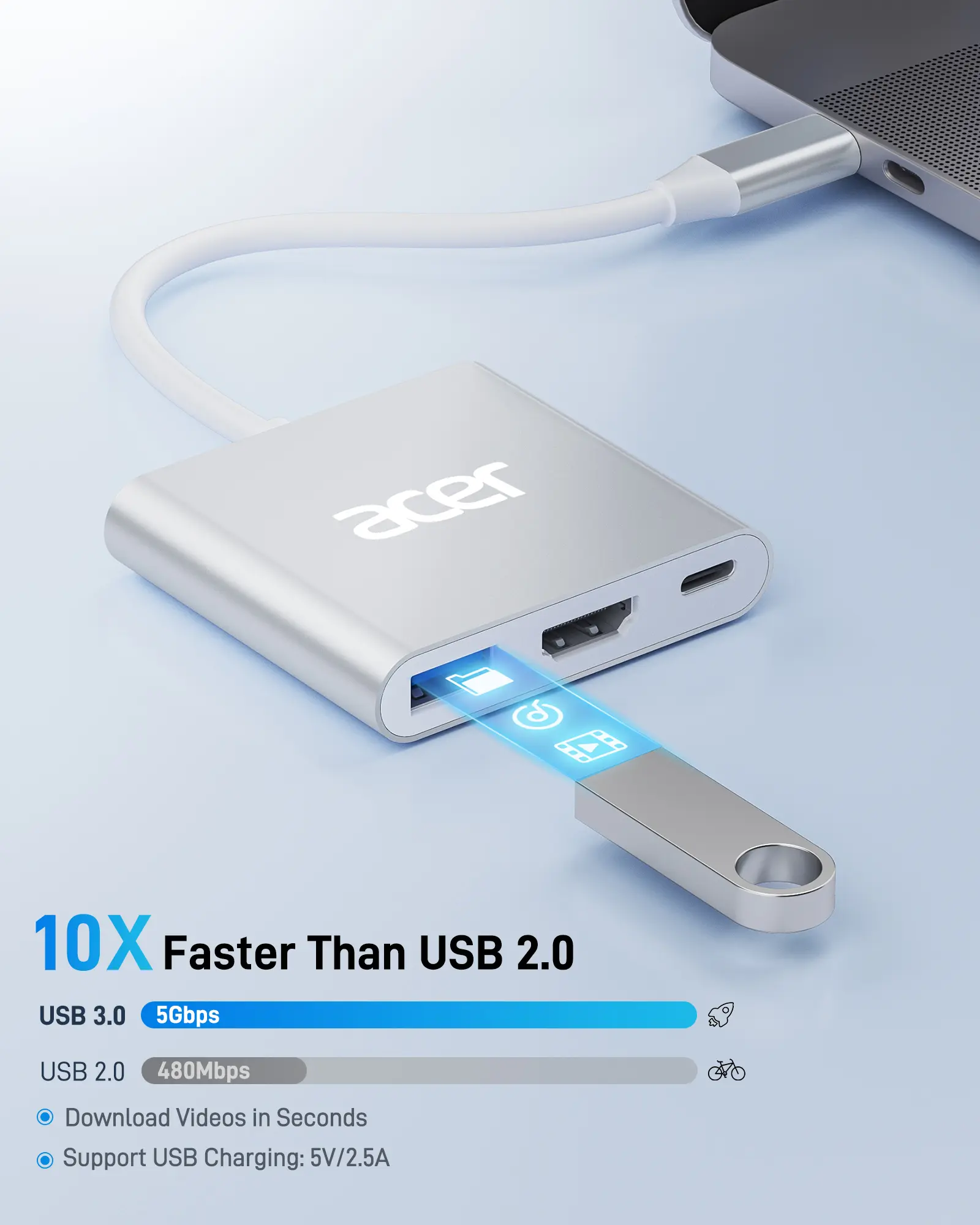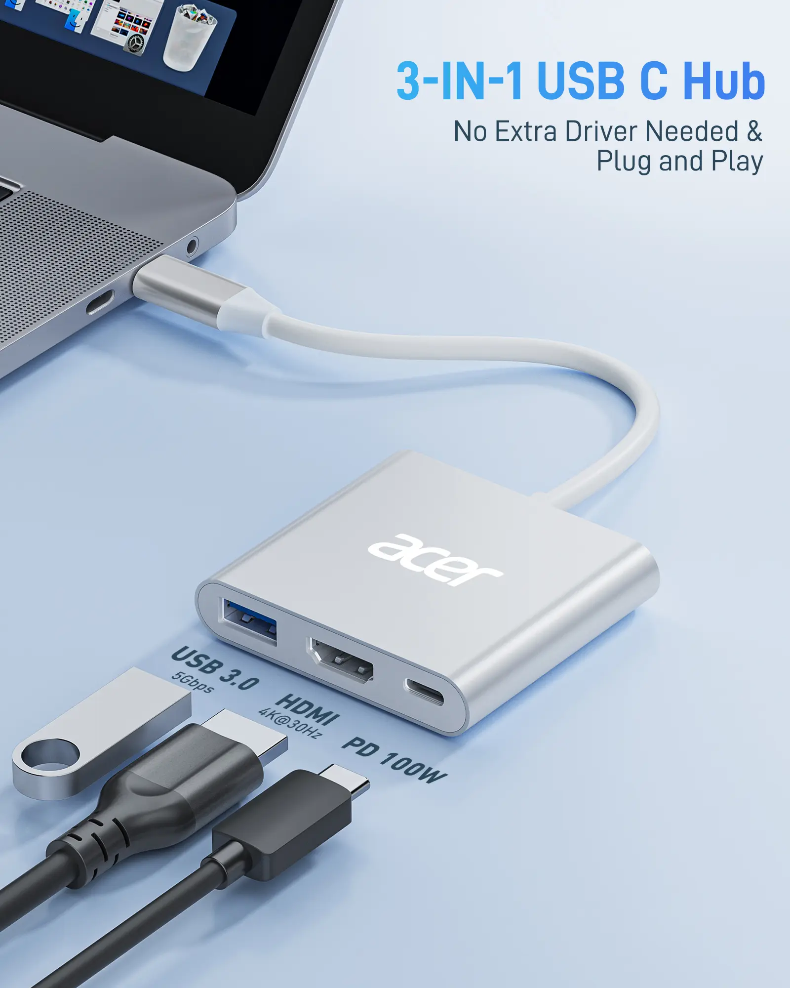 ·Versatile 3-in-1 USB C Hub: Upgrade your laptop's connectivity with the Acer USB C Hub. It offers a HDMI 4K@30Hz output port, a PD charging port (Charging function only), and a USB-A 3.0 port. Effortlessly mirror your iPhone or iPad screen to a TV, projector & monitor. Ideal for enhancing your home theater experience, optimizing office productivity, facilitating travel, and more.