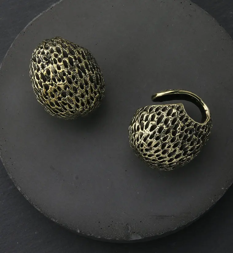 Handcrafted, brass ear weights with an oval-shaped, porous design resembling seeds like a strawberry. Height: 30mm, width: 25mm. Height and width are approximate as these are handcrafted. Size is 1/2" (12mm) with an approximate weight of 15 grams each. Sold in pairs (2pcs).