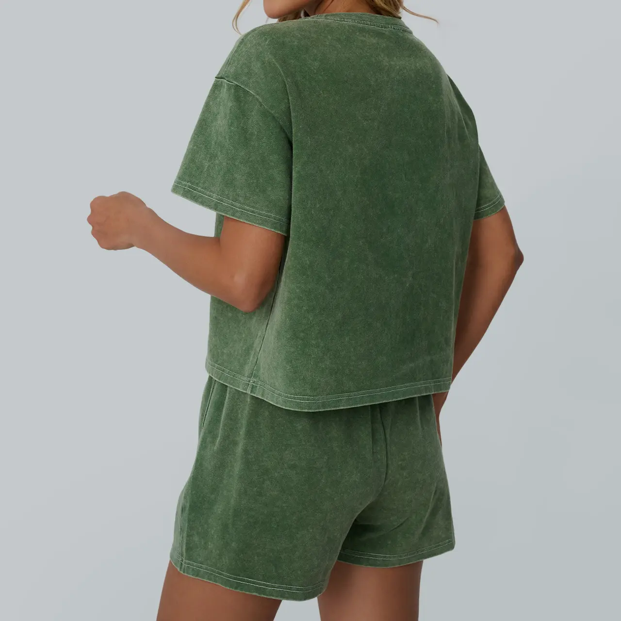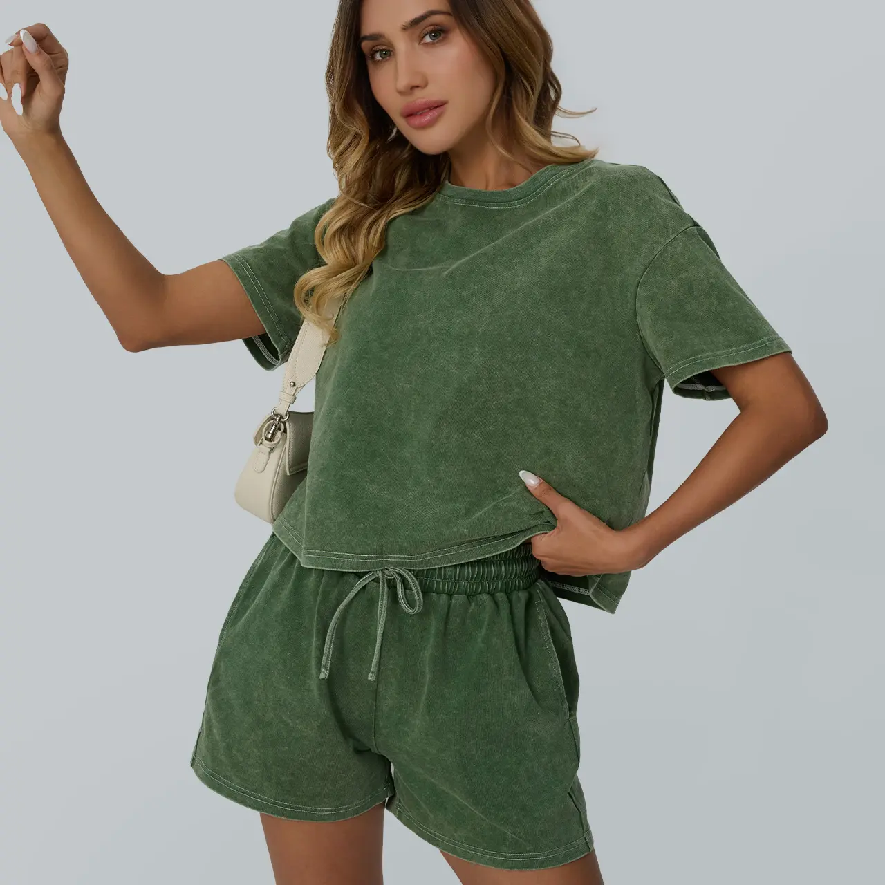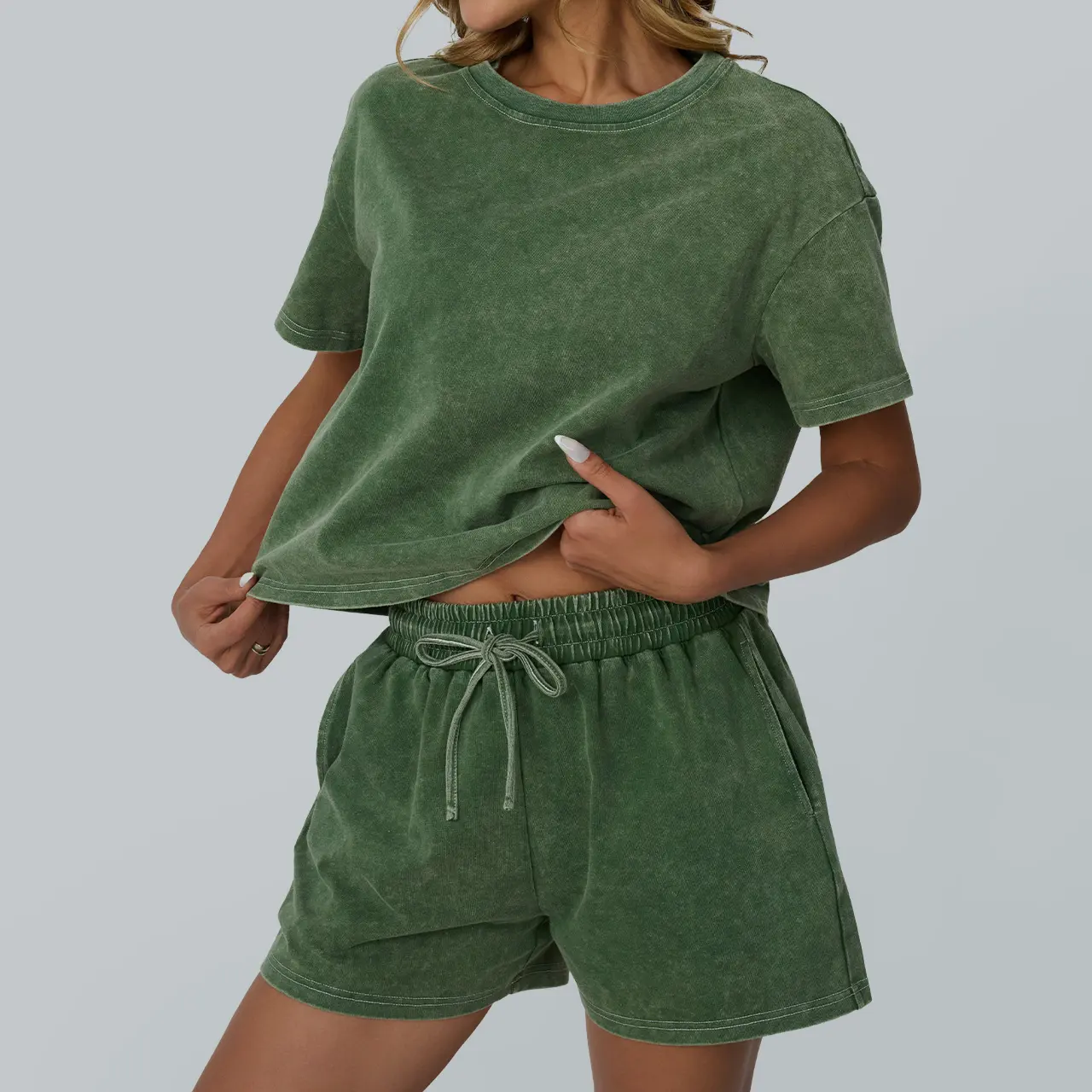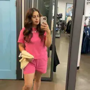 Love! I don’t like the way many two piece sets lay on my body type but this fits perfect. I’m 5’4” 156lbs I got a size medium! I rolled the shorts over once as I like them a little shorter but they fit perfect around the waste, shirt can be tucked or left out as a slight crop if preferred!
