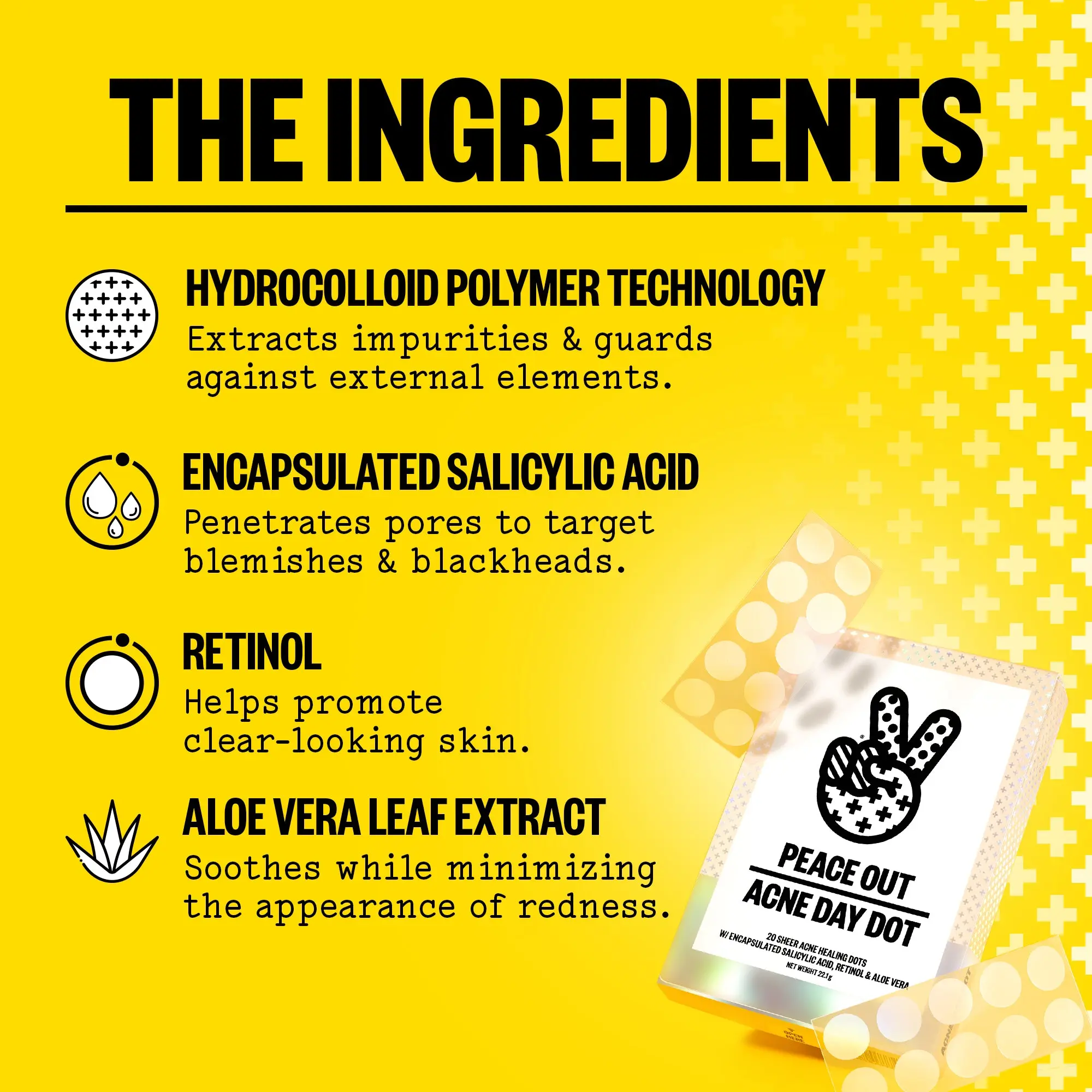 These are the BEST pimple patches that exist! I’ve tried many different ones and these work SO well to reduce acne, even on my cystic acne. Anytime i get a zit, with other patches it still takes a week or 2 for the cystic acne to get smaller, but with the Peace Out ones it literally gets smaller in one day and after a couple days of using these acne dote, its completely gone! It works like magic and I cant live without them!