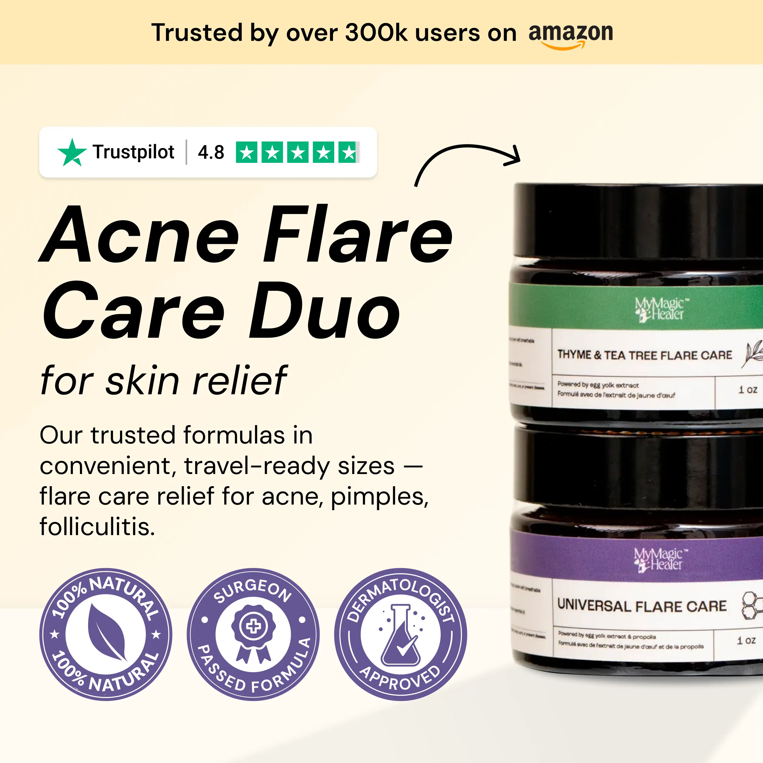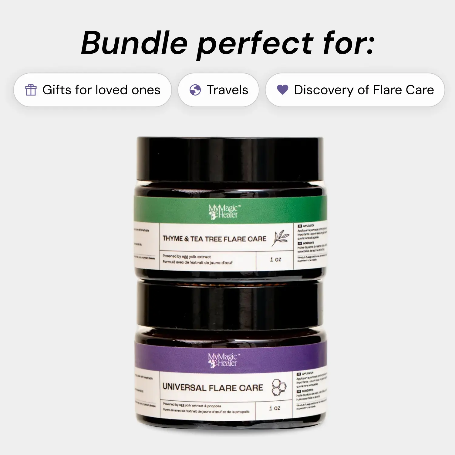 Includes Purple Universal Flare Care (1 oz) to calm active irritation and Green Thyme & Tea Tree (1 oz) for deep, stubborn breakouts like cysts and under-the-skin pimples.