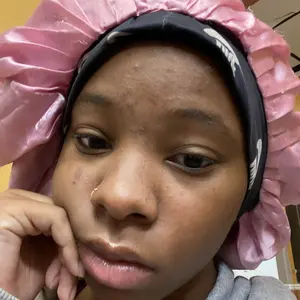 Great product this is my skin after only a week of use. Pink shirt is before bonnet is after .