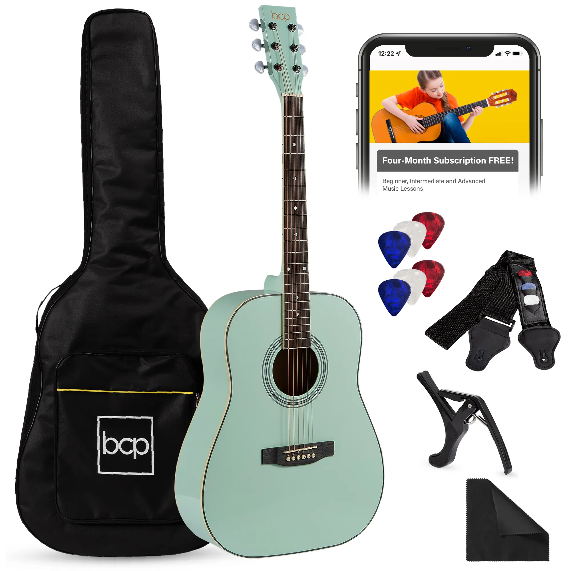 Includes: Acoustic guitar, Guitar pick, Guitar capo, Shoulder strap, Replacement strings, Cleaning rag, Nylon case