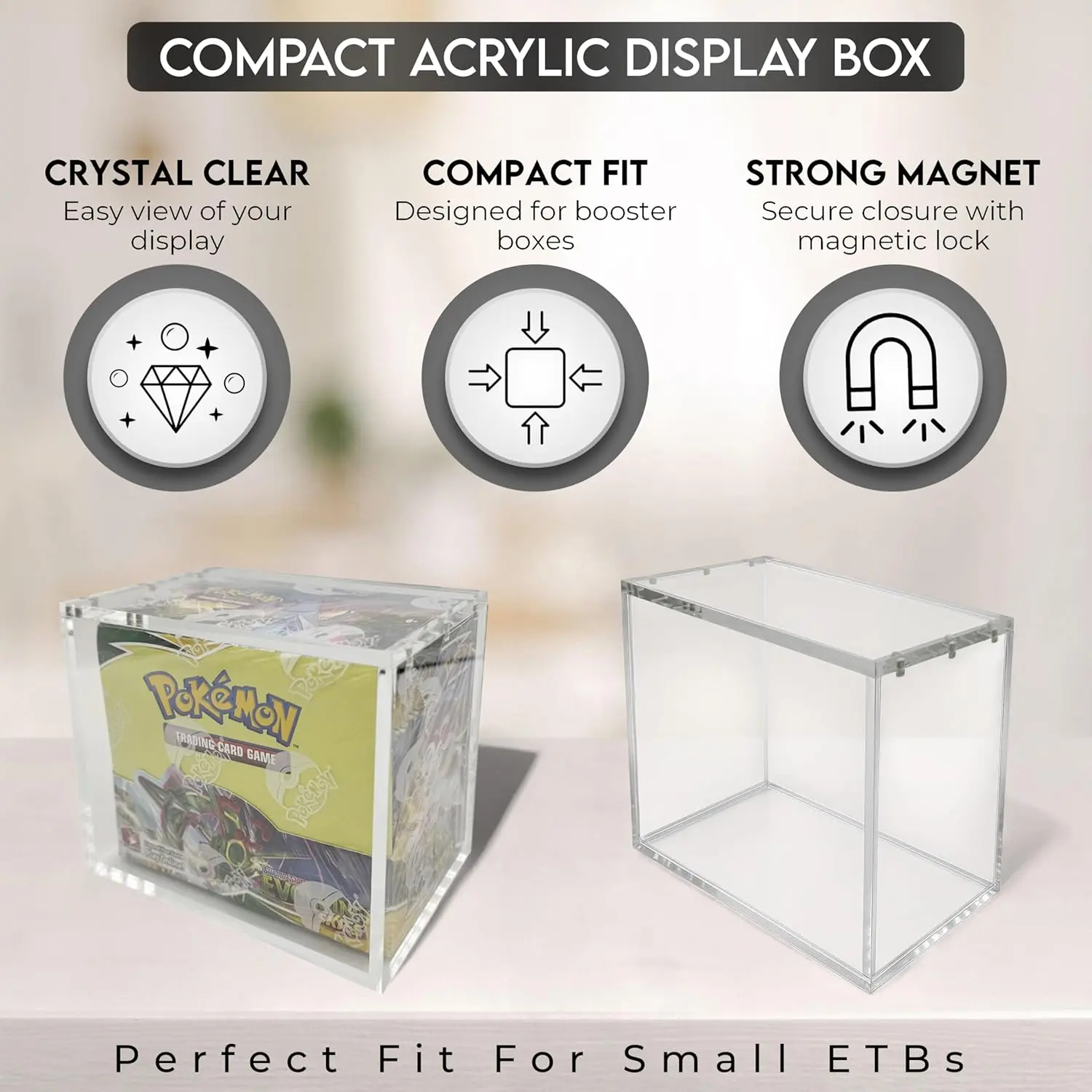 ·Perfect for Booster Boxes: This display case is designed specifically for booster boxes. It features an 8mm thickness on the sides, ensuring durability and protection. The 5mm magnetic lid adds an extra layer of security.