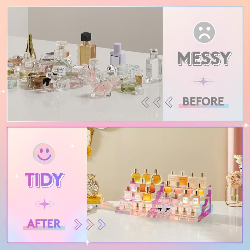 ·Iridescent Effect: This perfume organizer features an iridescent visual effect, displaying various colors that shift with different angles and lighting. It provides easy access and organization for your perfumes while adding a visually captivating touch to your display.