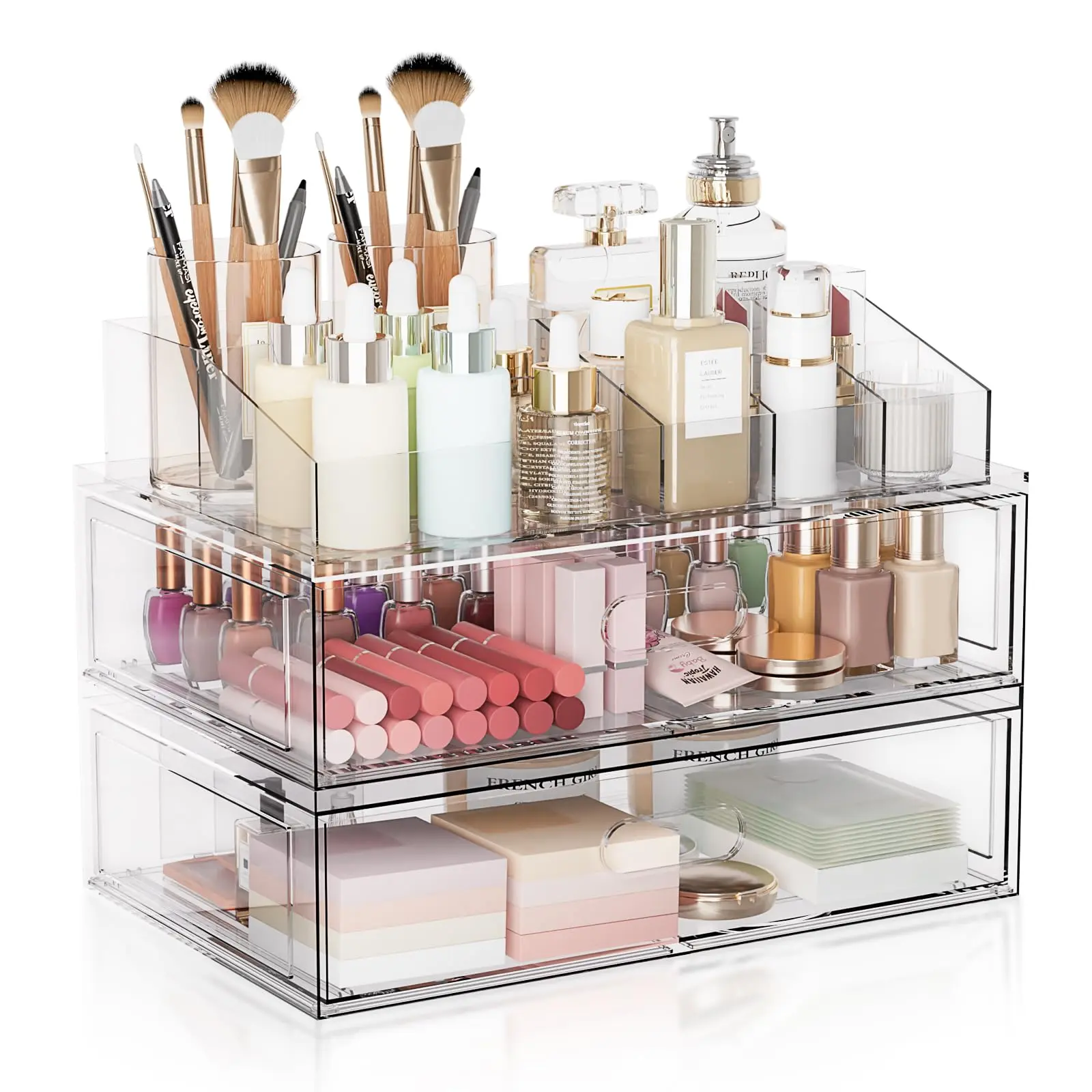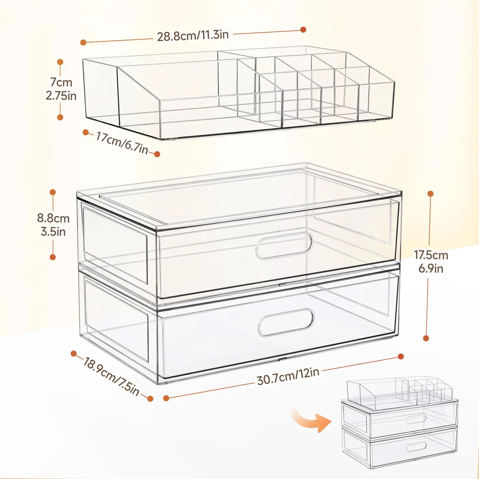 ยทSpace-Saving Solution: This acrylic organizers feature a stackable design that enables vertical storage, maximizing the use of every inch of space. Equipped with built-in slide rails, the drawers open smoothly and effortlessly, allowing for easy access and removal of items. Anti-slip silicone feet keep each drawer securely in place, preventing any sliding during use and enhancing safety and stability