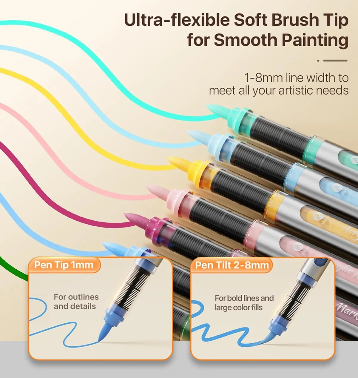 ·Flexible Brush Tip Markers for Direct Use: The soft brush tip design allows ink to flow without pressing, enabling you to create 1-8mm lines by adjusting the angle. Whether outlining or filling large areas, this paint marker does it all.