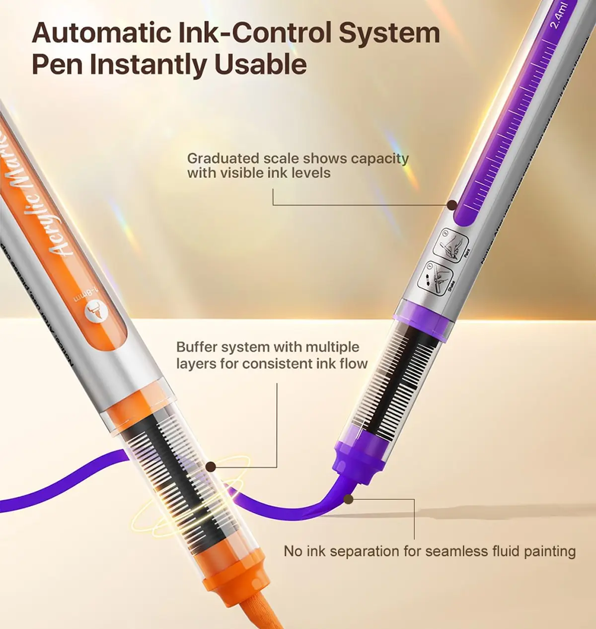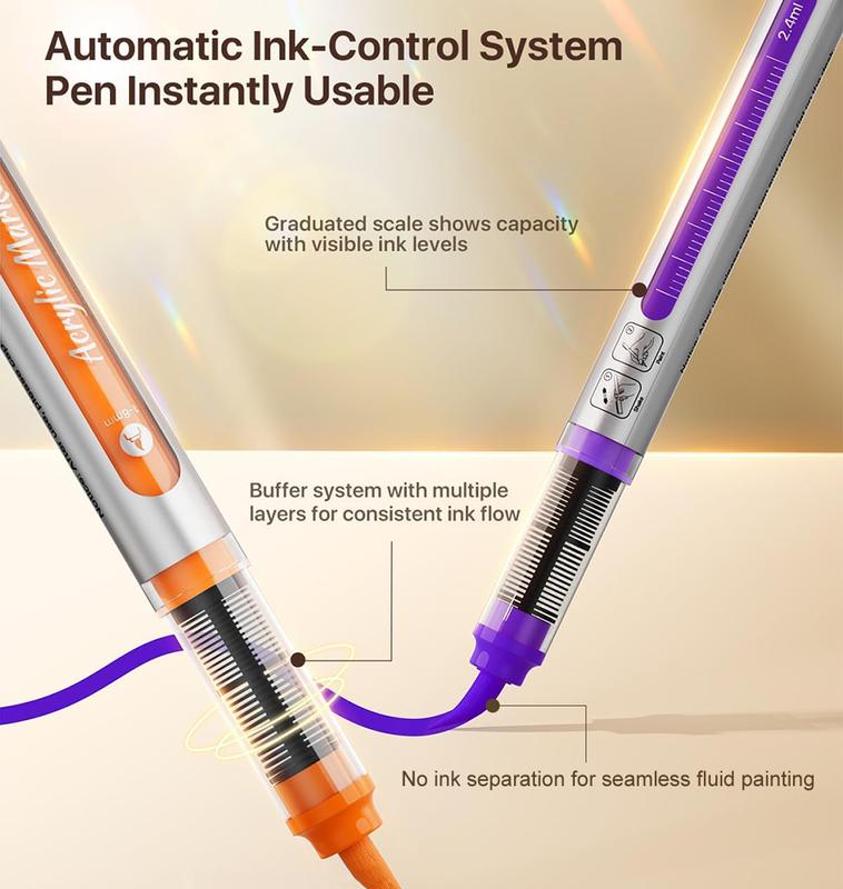 ·Unique Automatic Ink-Control System: The automatic ink-control system features multi-layer dividers in the grip area, ensuring smooth and even ink flow without flooding or clogging. Note: Shake before use for even color distribution and store horizontally when not in use.