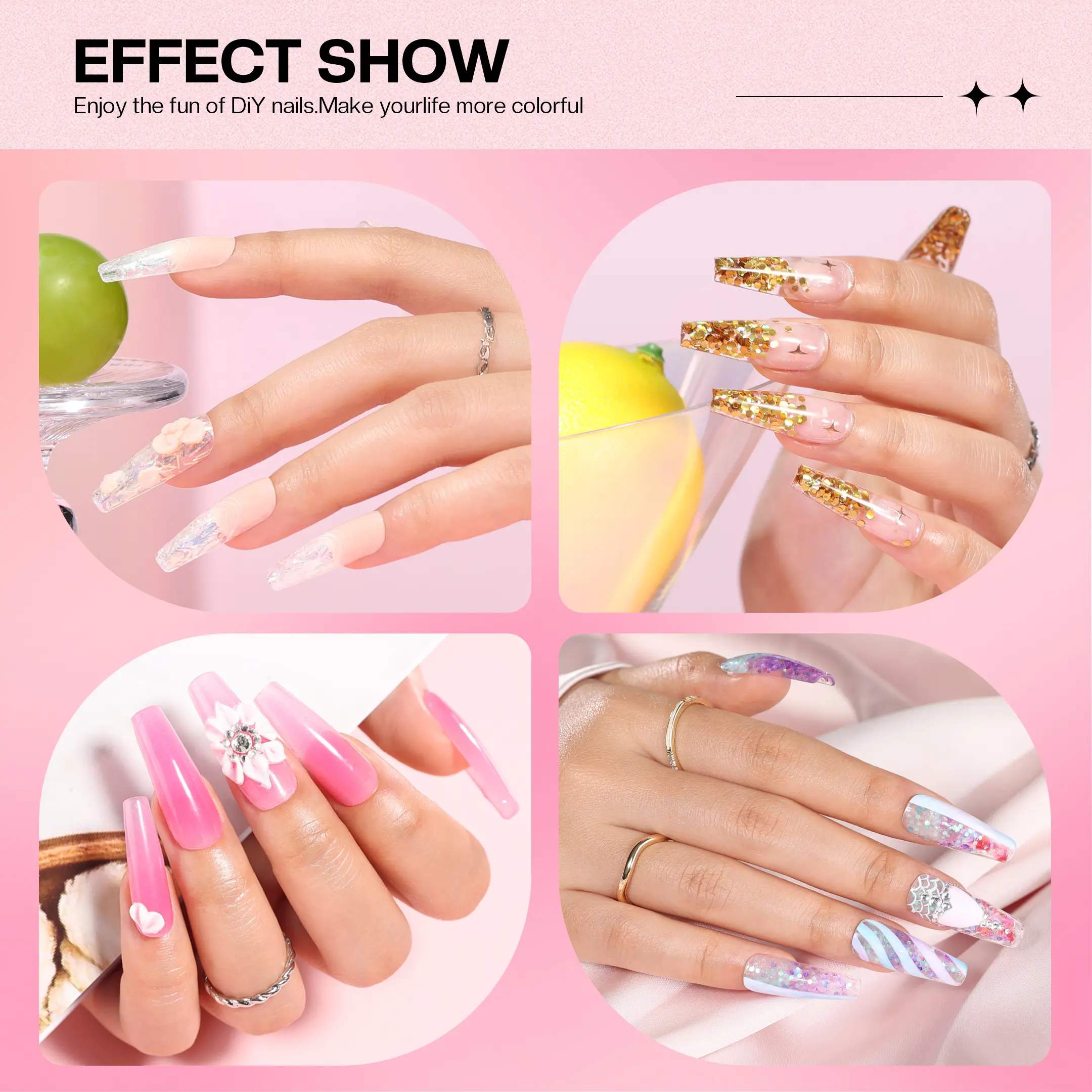 ·Nail Polish Kit&Glitters gel: Complete acrylic nail kit with U v light 48w Contain Gel Nail Polish can be used alone or with acrylic nails. Easy ways but different designs. Mix glitter and 4 acrylic powder to get a new color and style. You can DIY different nail inspired creations.