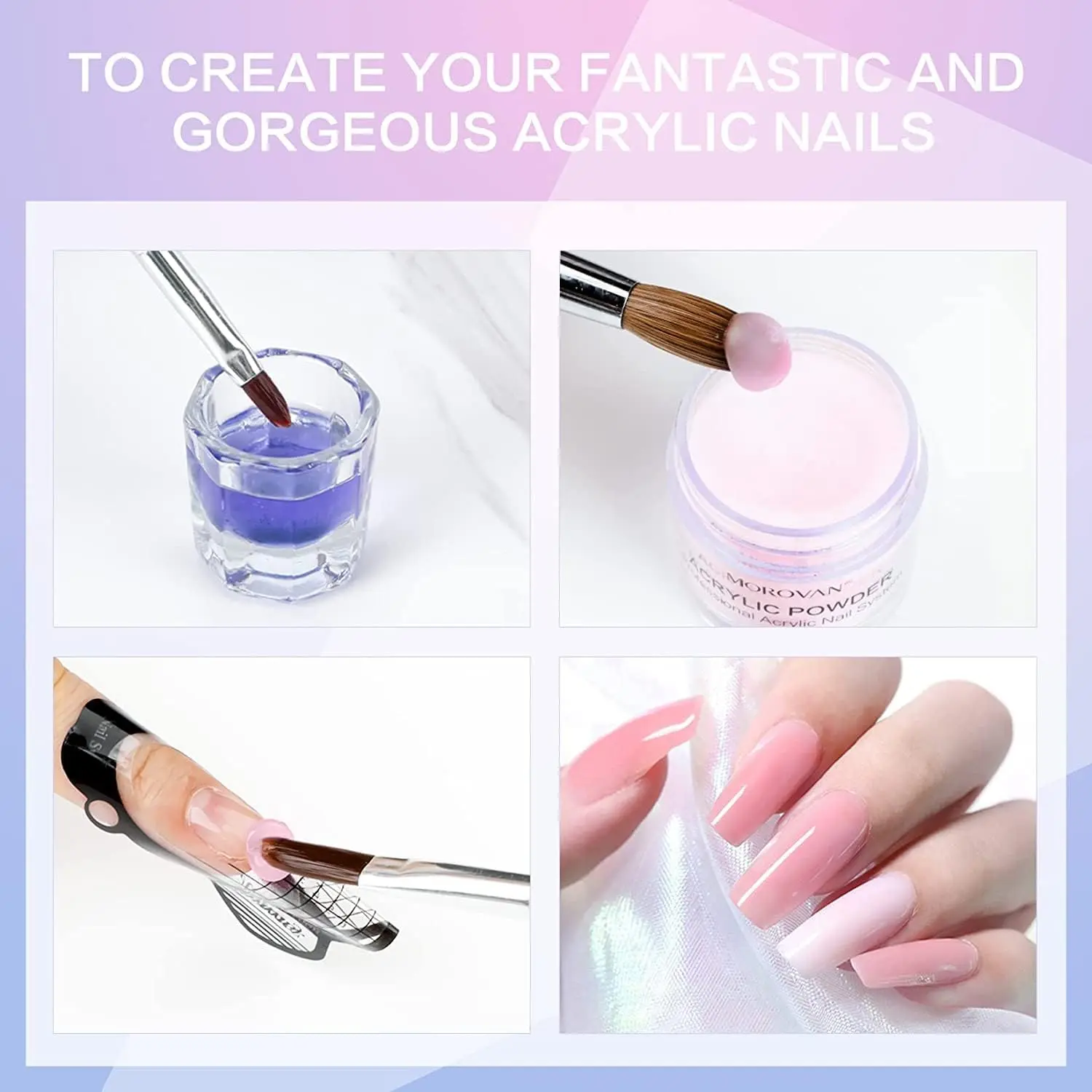 ·【Best Service of Acrylic Nail Kit】 Morovan promises to provide all our customers with an excellent nail kit acrylic set and services.f you have any questions about this acrylic nail kit, please feel free to contact us, replacement and refund services are always available. Bring your creativity to make stunning acrylic nails using this acrylic nail set. Please feel free to buy this acrylic nail set, enjoy your shopping~