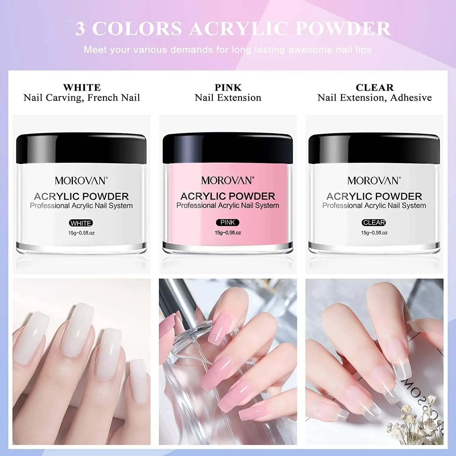 ·【Easy for Begginers】Morovan professional acrylic nail kit comes with 3 colors of acrylic nail powder (white, clear, pink), acrylic nail powder is bubble-free polymer that will offer extraordinary clarity and provide a smooth self-leveling finish. Acrylic nail powder is also very simple to use, it only takes 6~7 minutes to completely dry, mix glitters and nail gem to get a new color and style.A variety of colors to meet a variety of creative needs, you can create your favorite nail style at will.