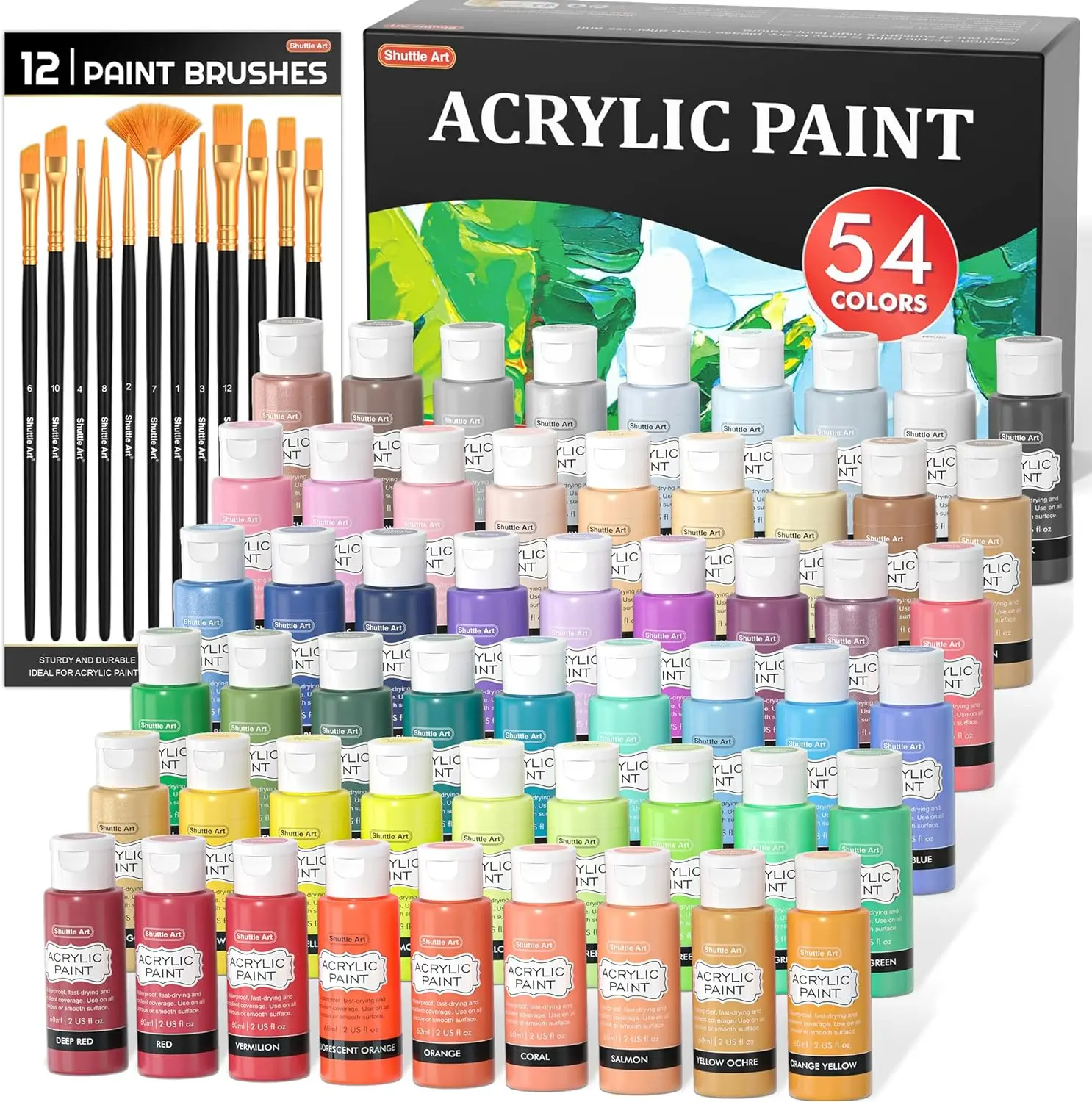 ·42 VIBRANT COLORS: Shuttle Art 54 pack acrylic paint set comes with 42 unique colors acrylic paint in 60ml/2oz bottles and 12 paint brushes, including the most commonly used colors and inspiring hot fluorescent and metallic colors to your art projects, ideal for painting and crafting.