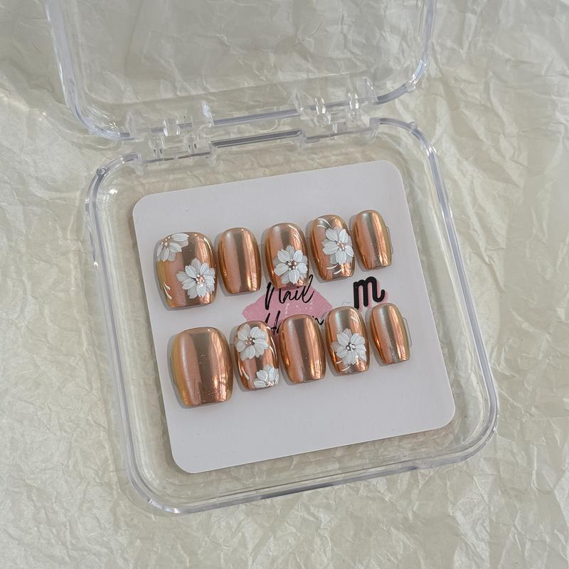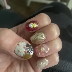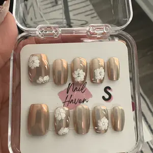 Product quality: durability of the nails and the glue. I applied the nails and by the next day they were coming off and had even started changing in the decorated area which was disappointing. As you can see in the 1st picture the pointer finger nail the design has turned black when it's supposed to be gold. I just applied these nails LAST NIGHT, I took a shower this morning and after the shower I noticed the discoloration. It's not too much of a big deal but I do want the nails to stay the color I bought them in. I also added the gems to the inside of the flowers to add some extra sparkle ✨.