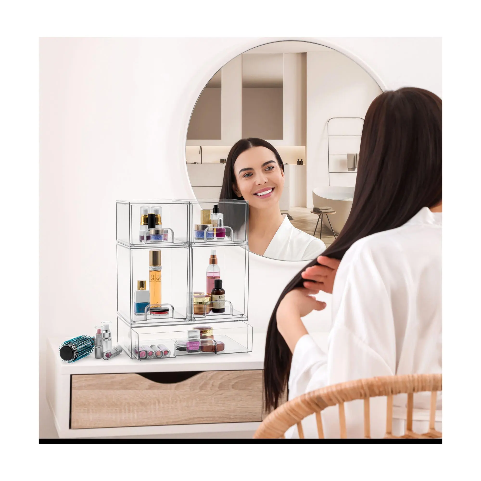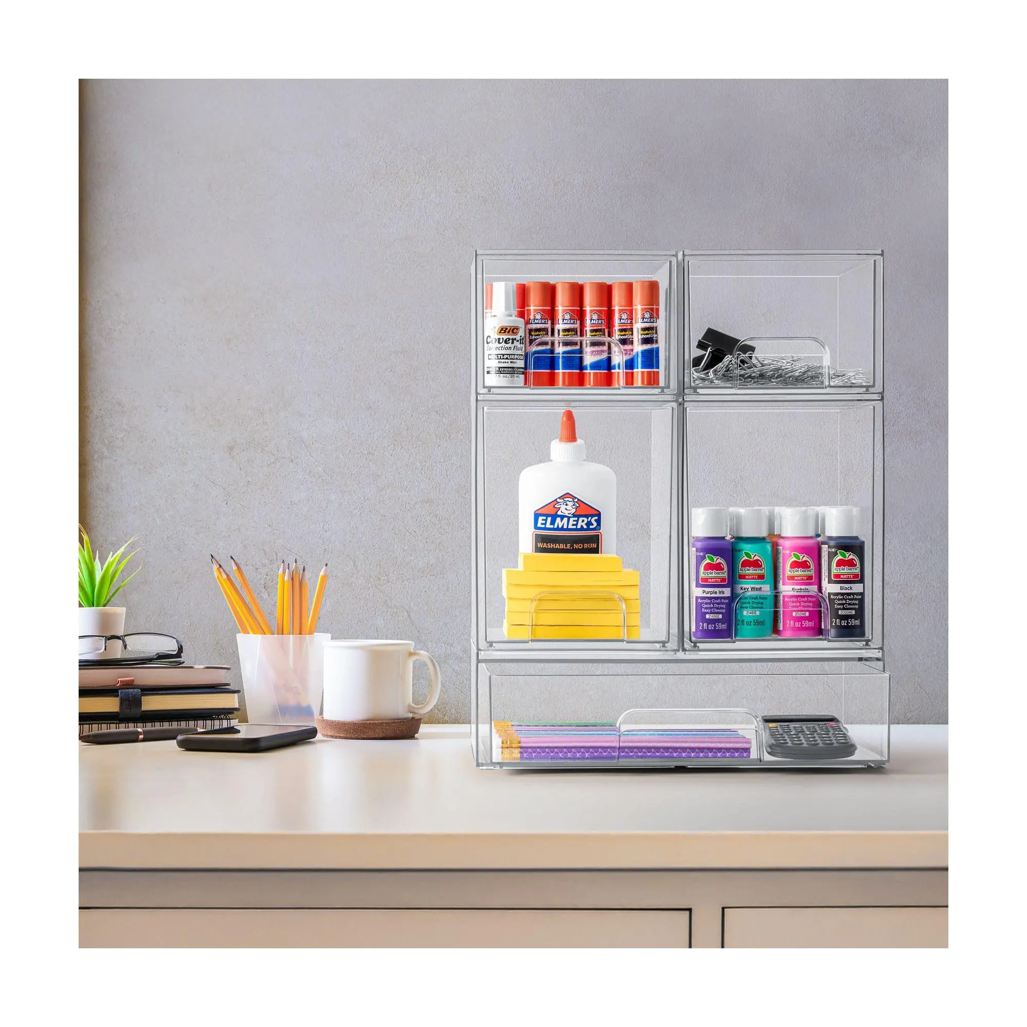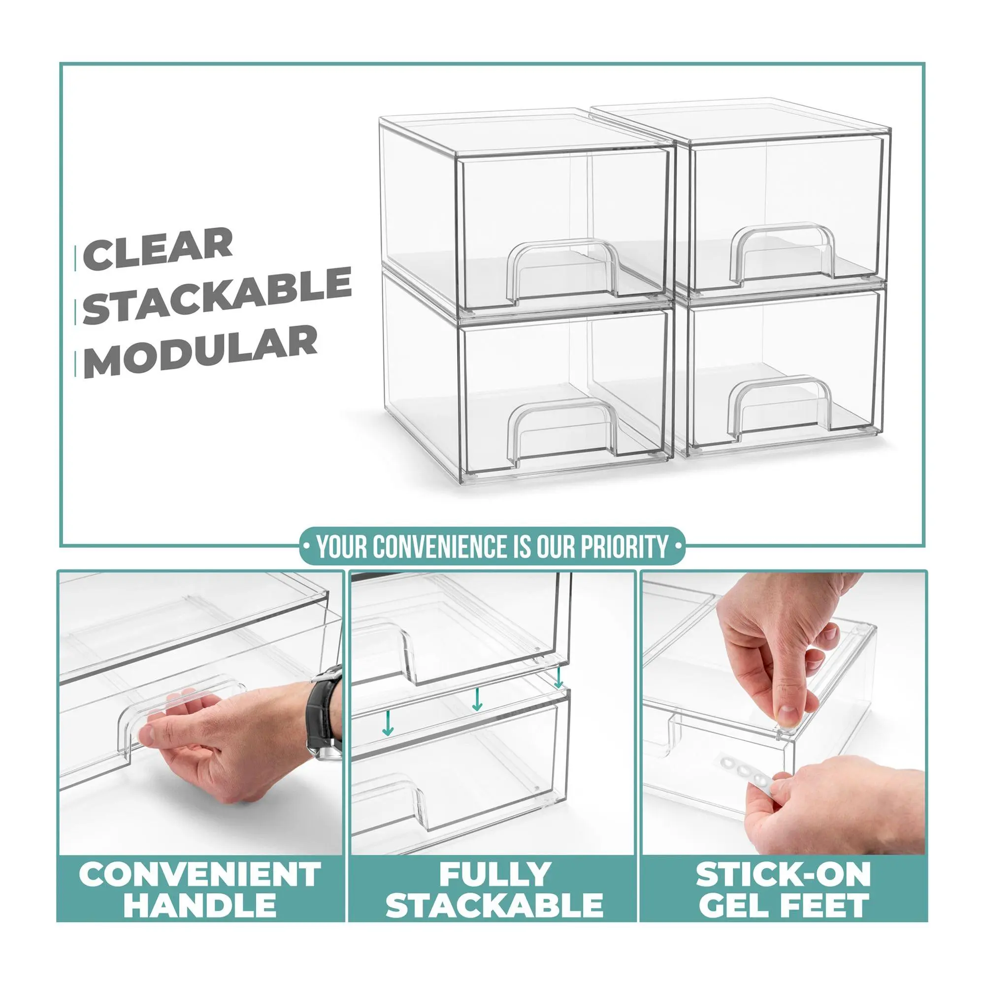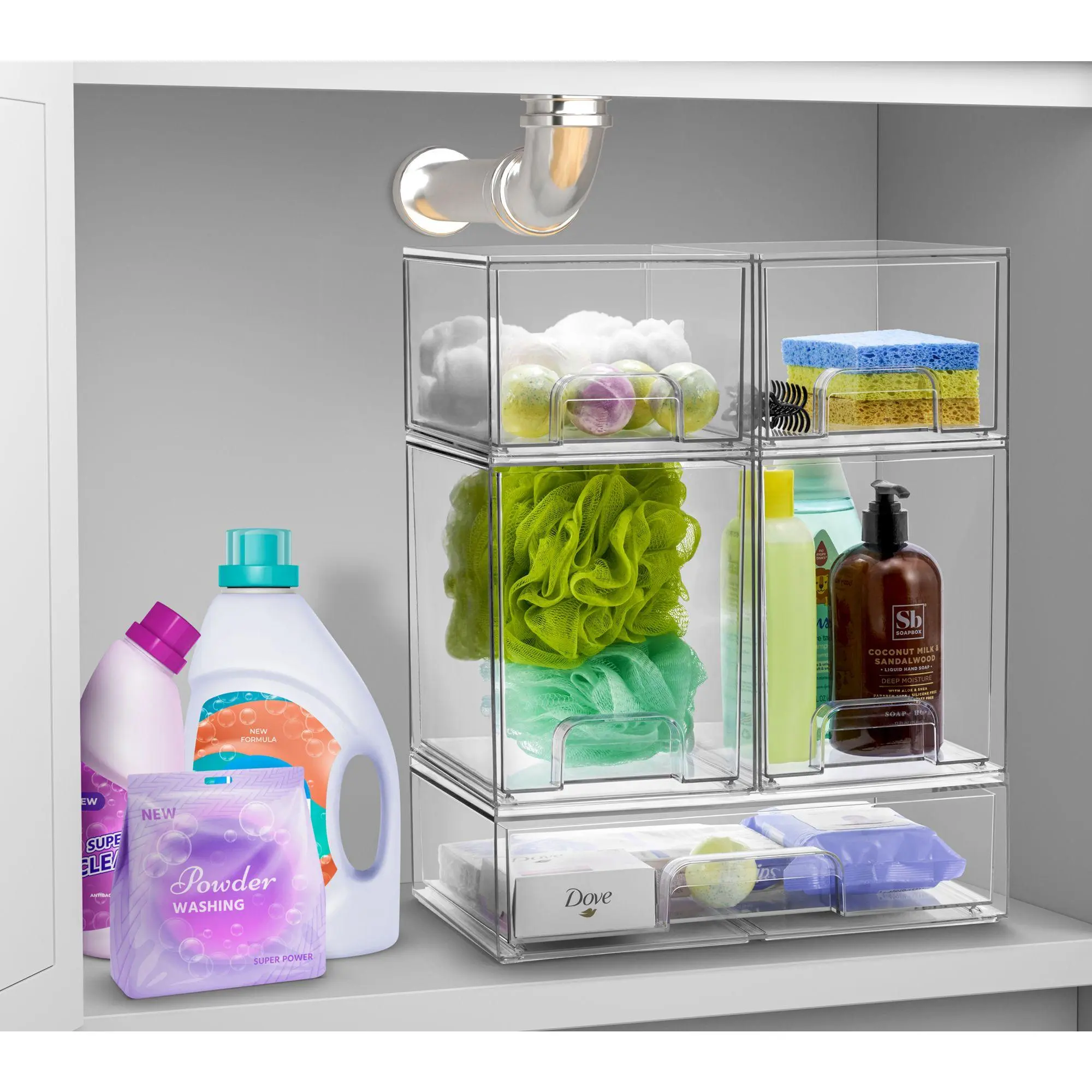 The Sorbus Clear Organizer Drawers offer a versatile, stackable design to maximize storage and customize your space. Perfect for organizing countertops, cabinets, or under-sink areas, this acrylic system is ideal for makeup, pantry items, office supplies, and more. With smooth-gliding pull-out drawers and built-in handles, accessing essentials is effortless. These durable and stylish organizers blend seamlessly with any decor and are easy to clean with soap and warm water. From Sorbus.