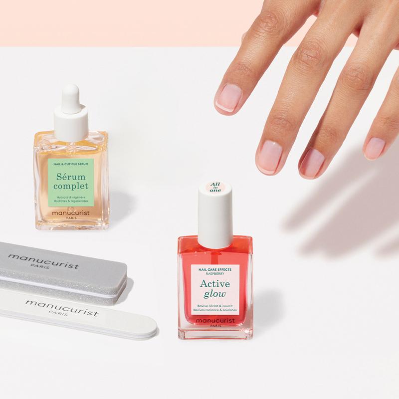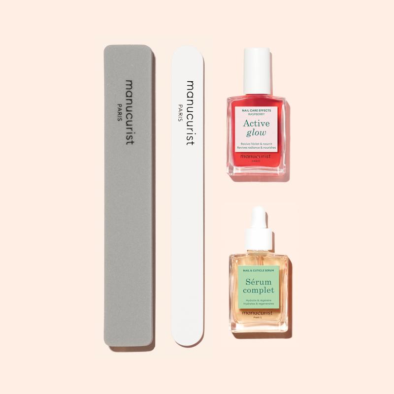 A 3-step care routine featuring the manicure essentials: 1 file, 1 buffer sponge, 1 Active Glow™ Raspberry and 1 Complete Serum to deeply moisturize nails and cuticles.
