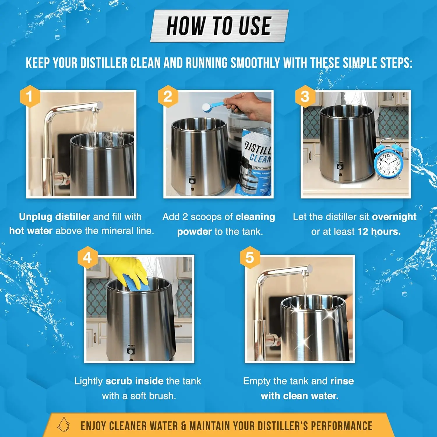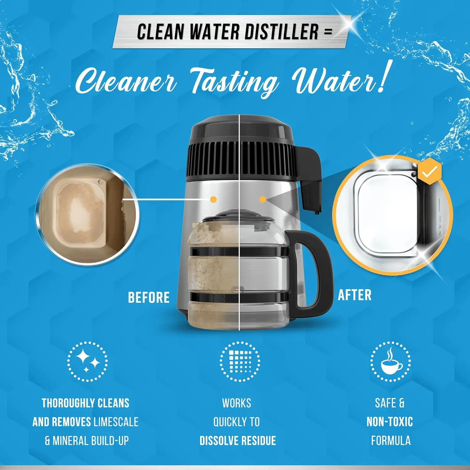 Mineral Deposit & Water Residue Cleaner: Remove Stubborn Build-up & Residue to Extend the life of your machine, Improve the Quality of your Water for your safety. Cleans Normal Limescale, Calcium and other residue in both the Water Distiller Tank and Carafe of machine