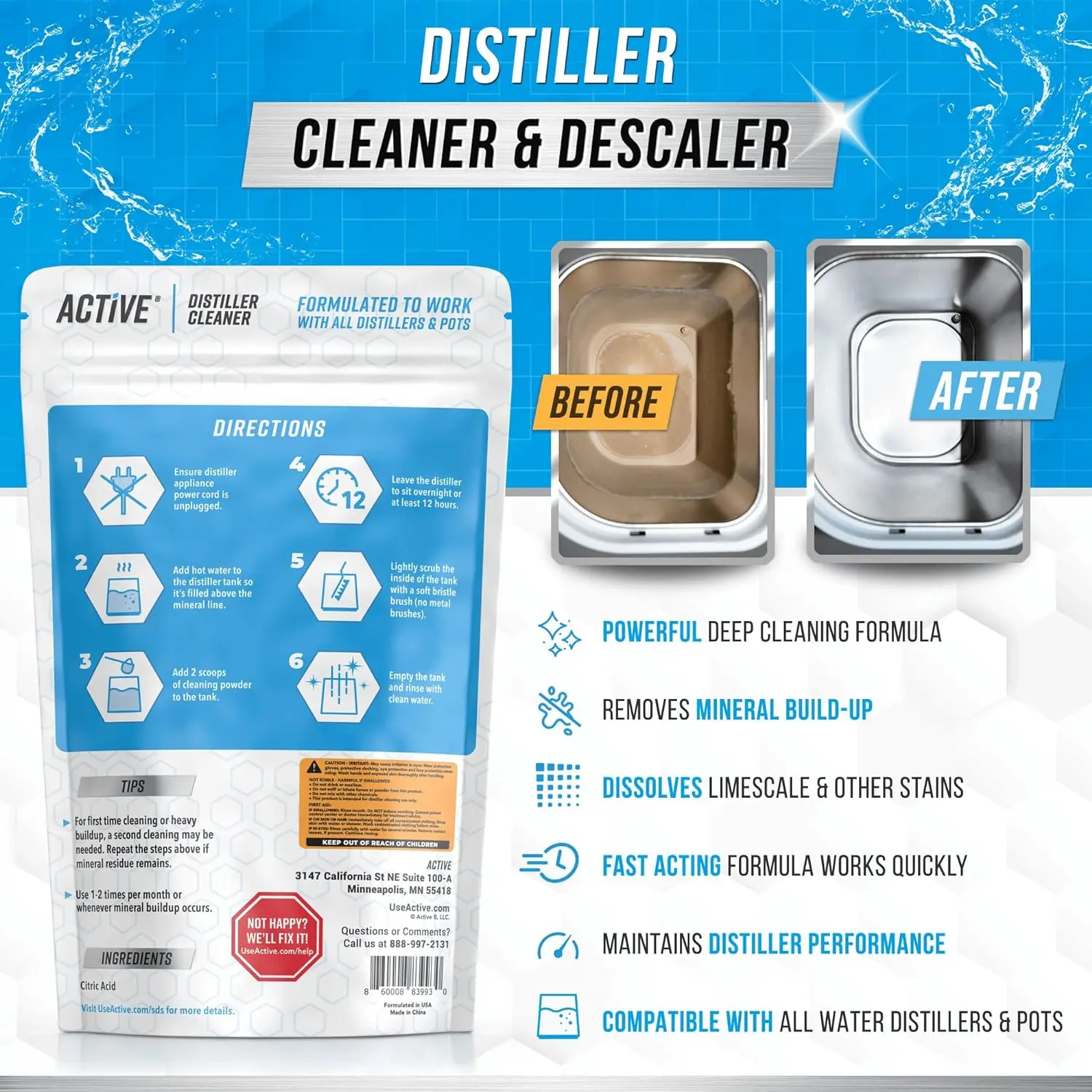 Water Distiller Cleaner Agent: ACTIVE is Compatible with Waterwise, Kleenwise, H2Olabs, Kenmore, Vevor, Vivohome, Megahome, Mophorn, CO-Z, Zojirushi & More. Safe for Cleaning Countertop, Portable Distiller