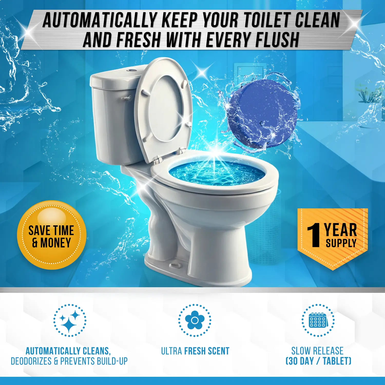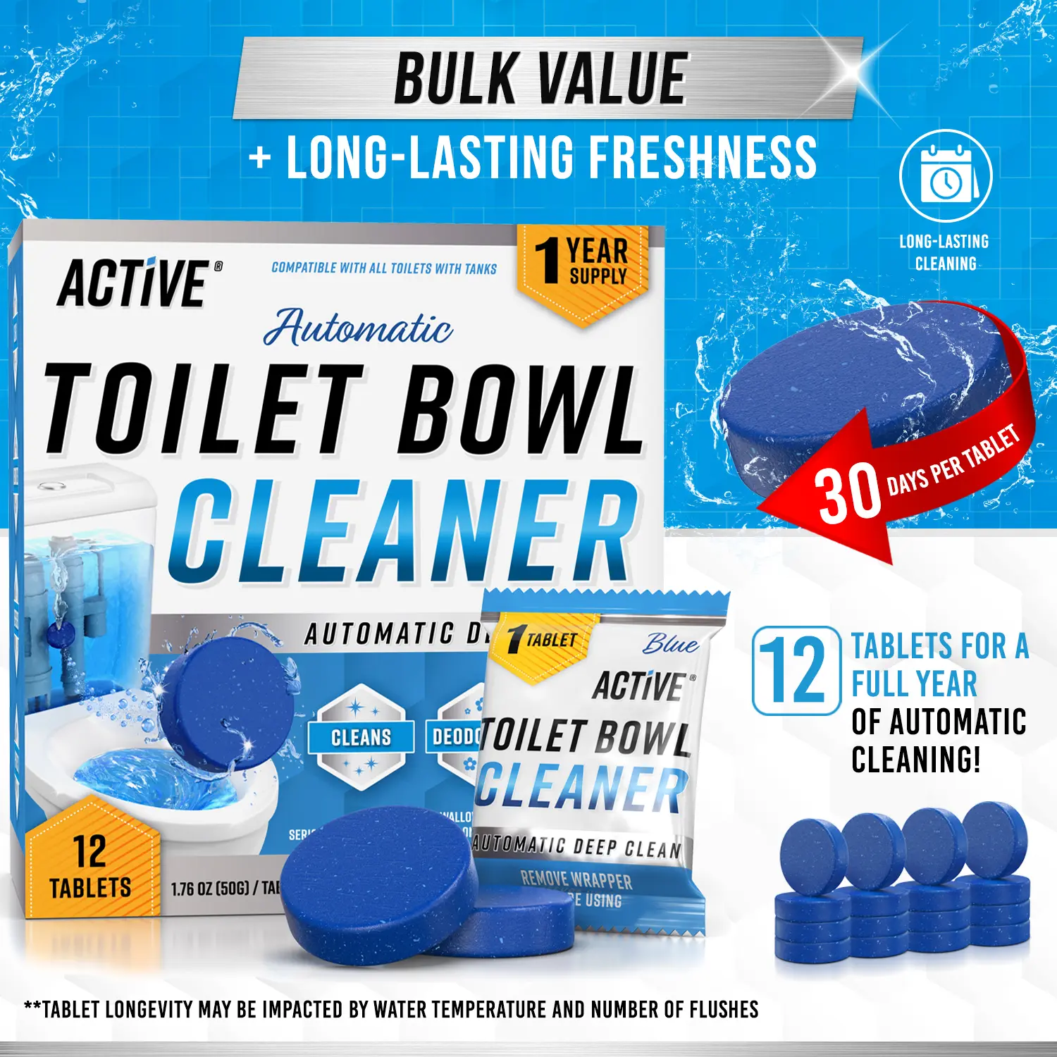 ·Long-Lasting Toilet Bowl Freshener: Say goodbye to bad odor. Active Toilet Tablets deliver Continuous Cleaning, with an Ultra Fresh Scent for 300 Flushes or more, which lasts up to 30 Days per bathroom (based on best estimate for average household use)